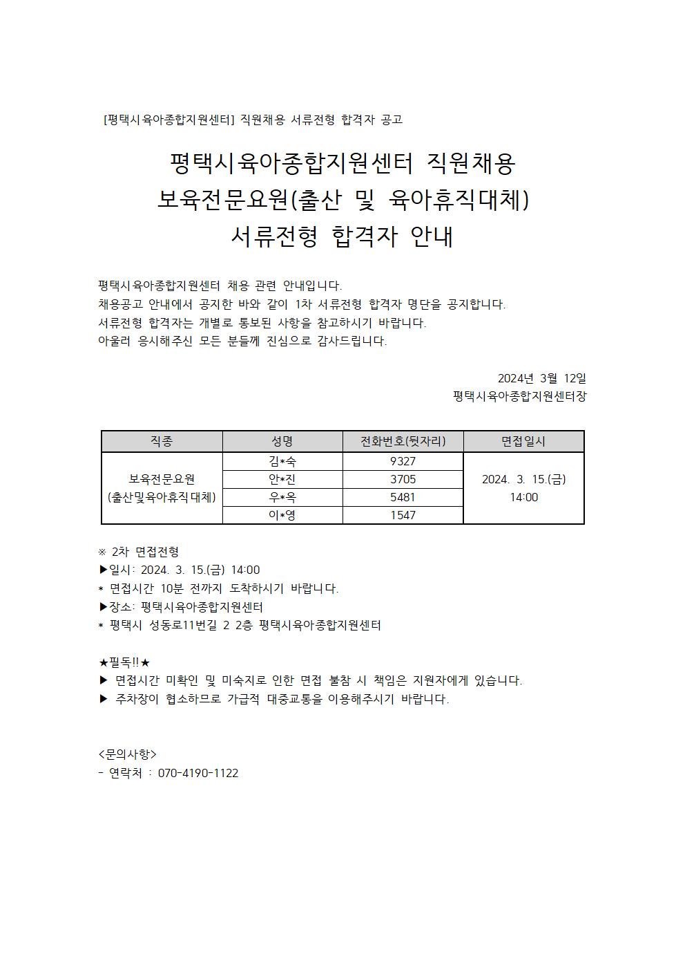 [평택시육아종합지원센터] 직원채용 1차 서류전형 합격자 안내(보육전문요원-출산및육아휴직대체)