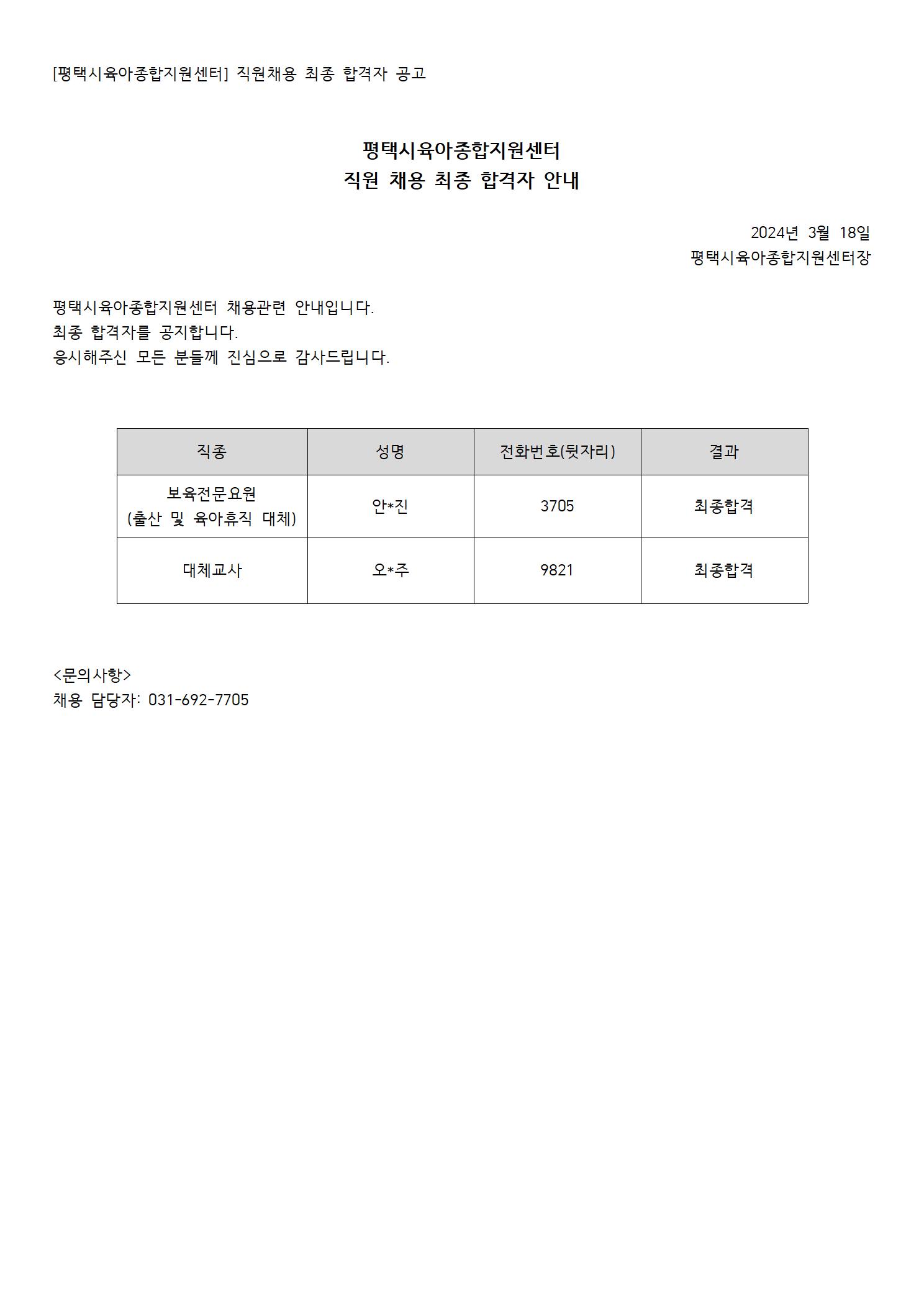 [평택시육아종합지원센터] 직원 채용 최종 합격자 공고(보육전문요원, 대체교사)