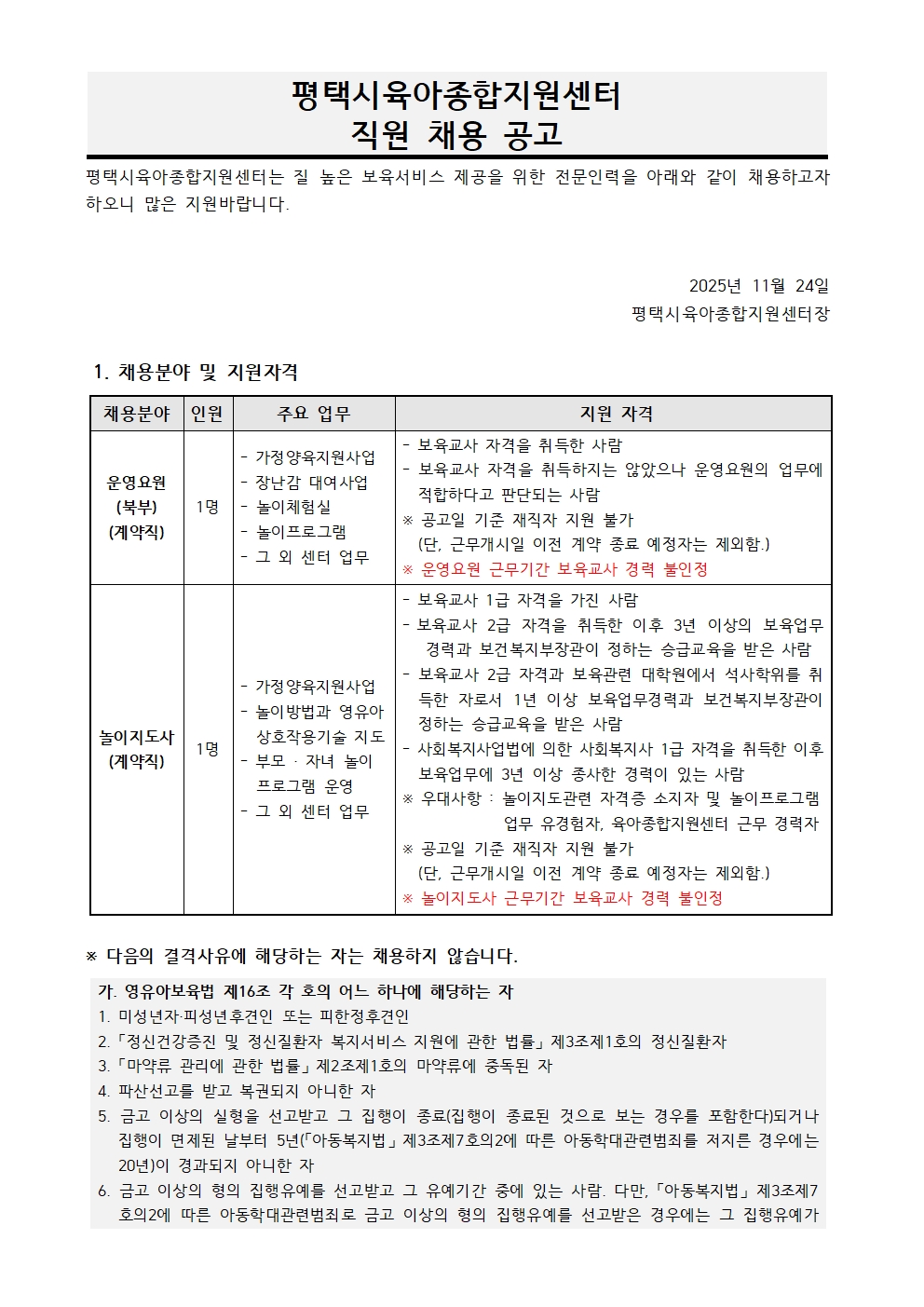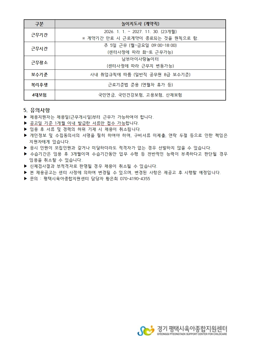 [평택시육아종합지원센터] 직원 채용 공고(운영요원, 놀이지도사)
