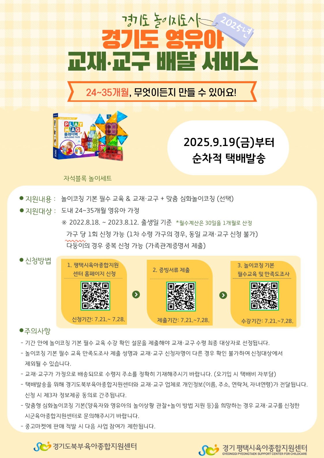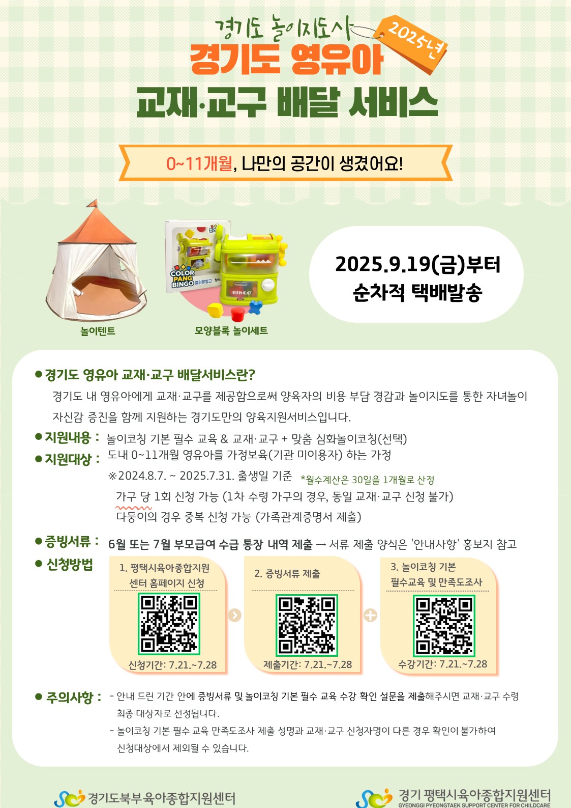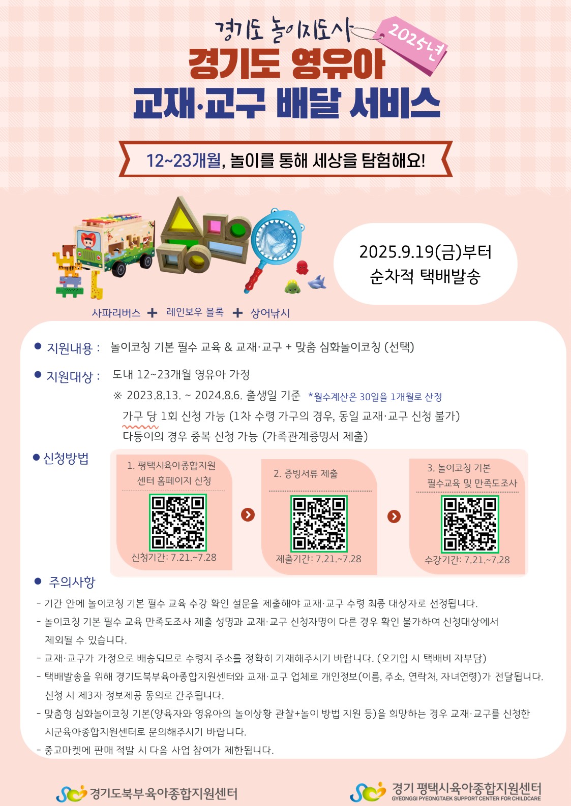 | 2025년 경기도 놀이지도사 『영유아 교재 교구 배달 서비스』 2차 모집 | |||||