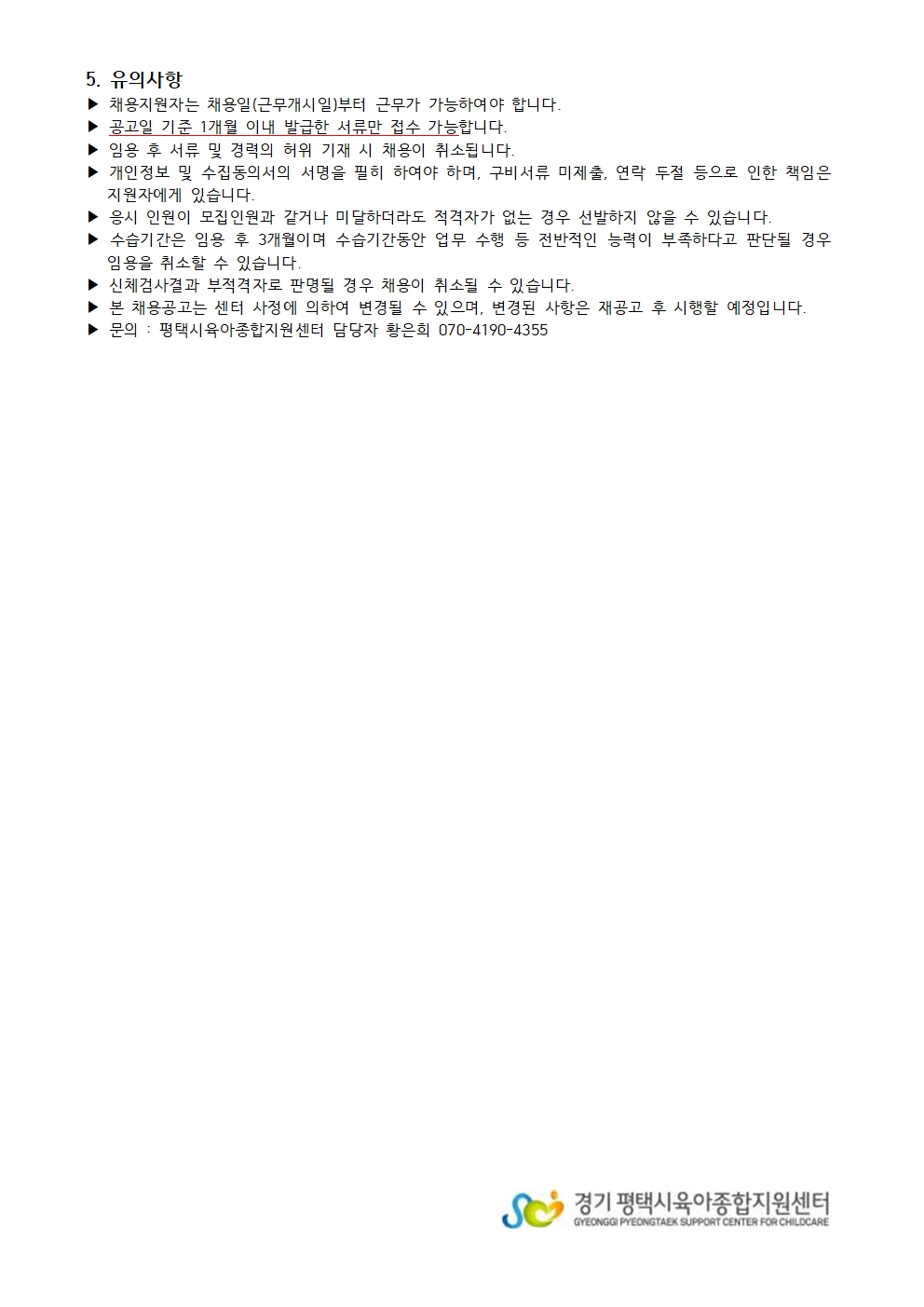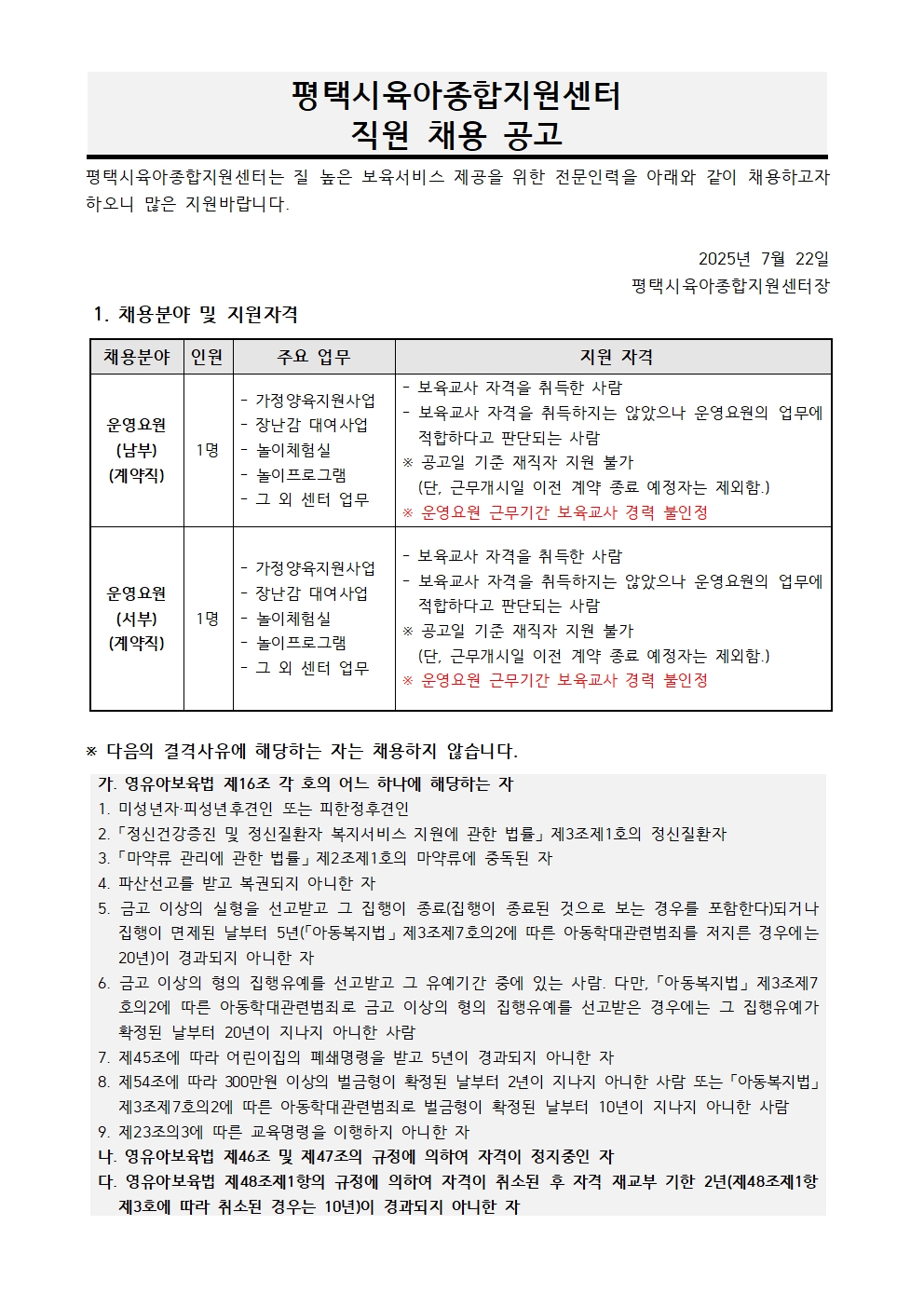 [평택시육아종합지원센터] 직원 채용 공고(운영요원)