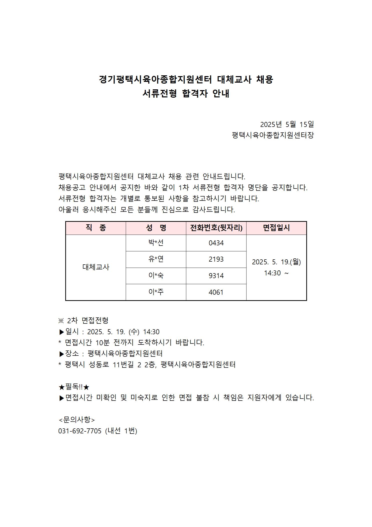 [평택시육아종합지원센터] 직원채용 1차 서류전형 합격자 안내(대체교사)