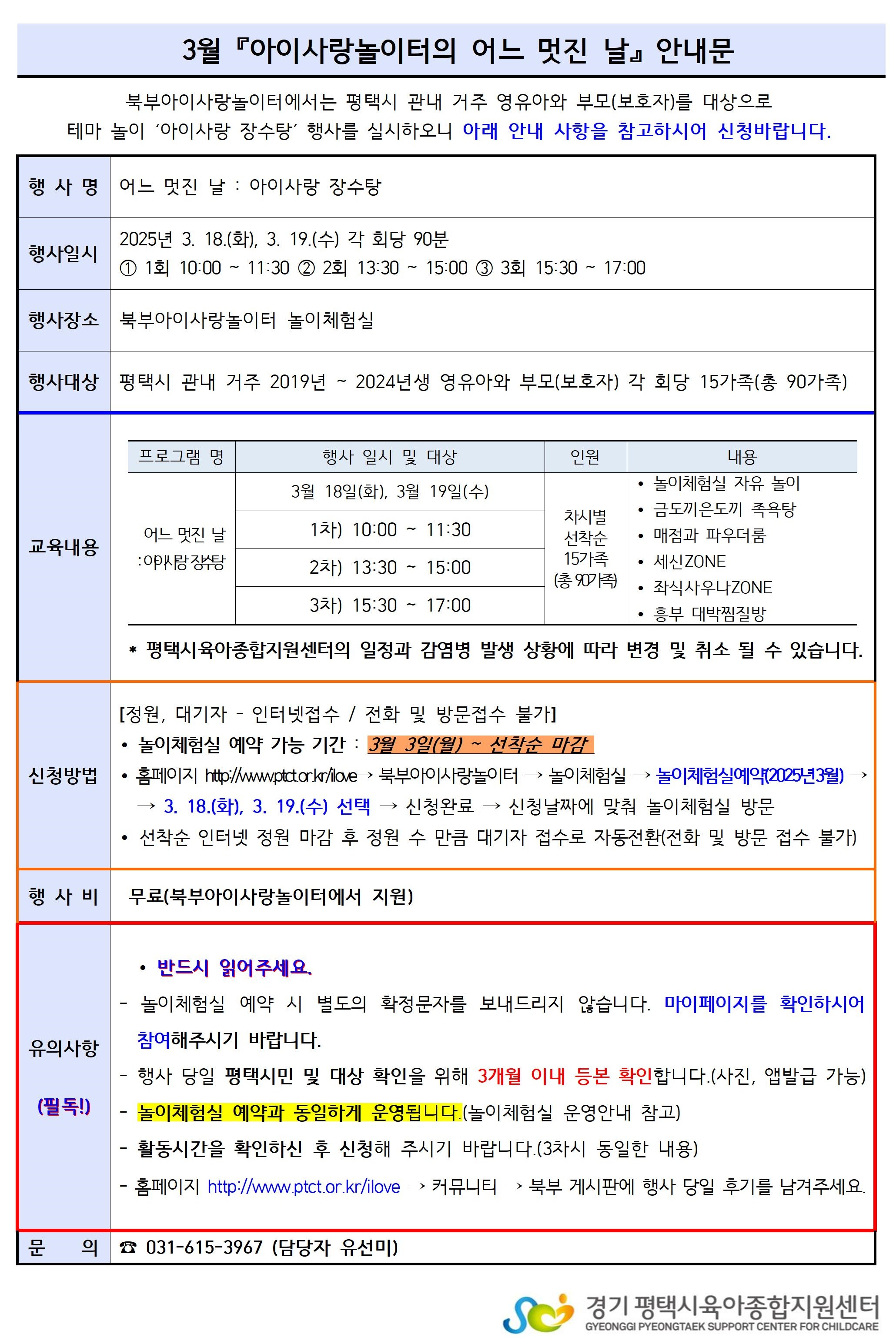 - 신청방법은 북부아이사랑놀이터 놀이체험실 예약방법과 동일하며, 3. 3.(월) 10:00부터 신청 가능합니다. (안내문 참고)