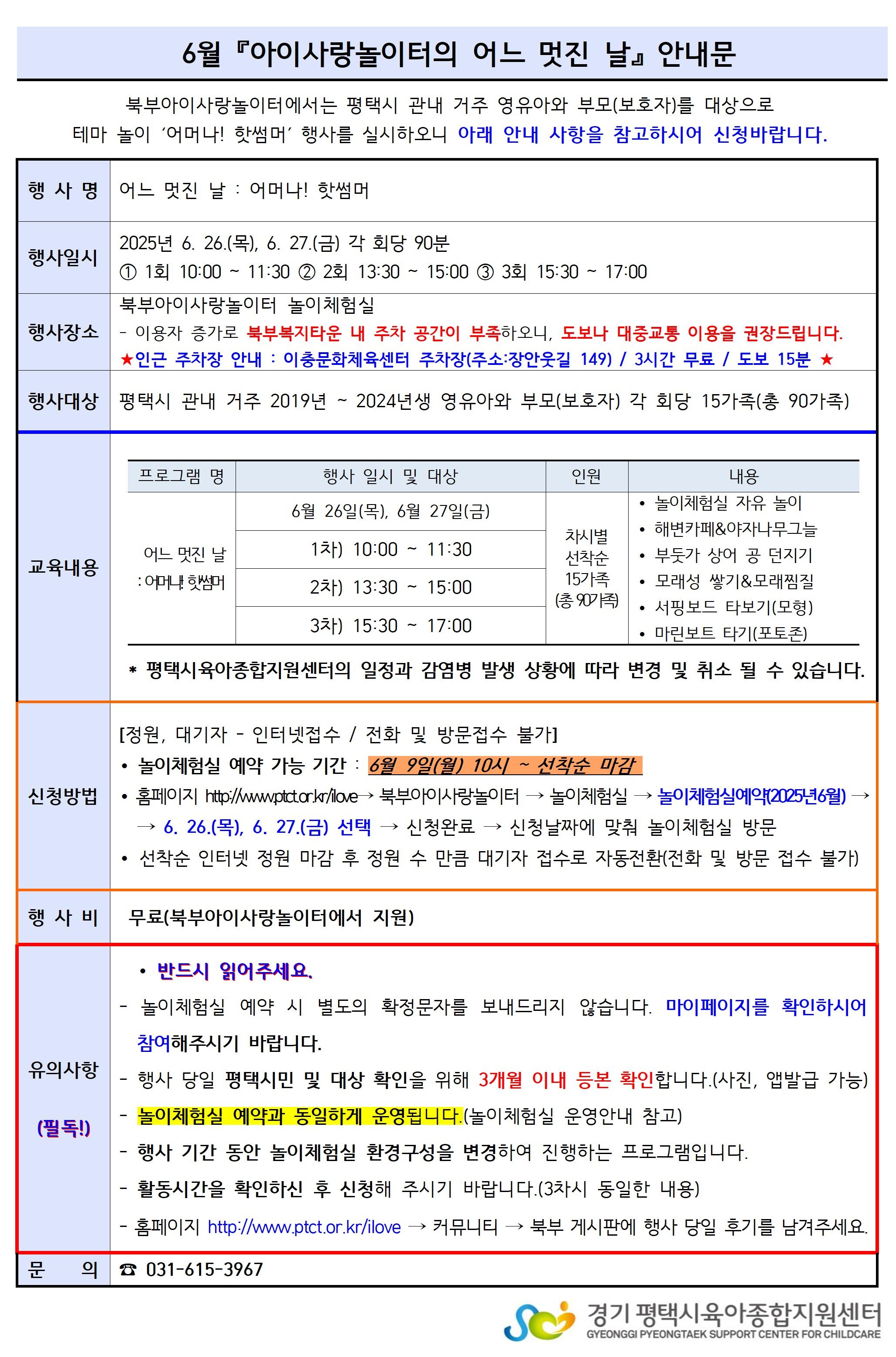 - 신청방법은 북부아이사랑놀이터 놀이체험실 예약방법과 동일하며, 6. 9.(월) 10:00부터 신청 가능합니다. (안내문 참고)