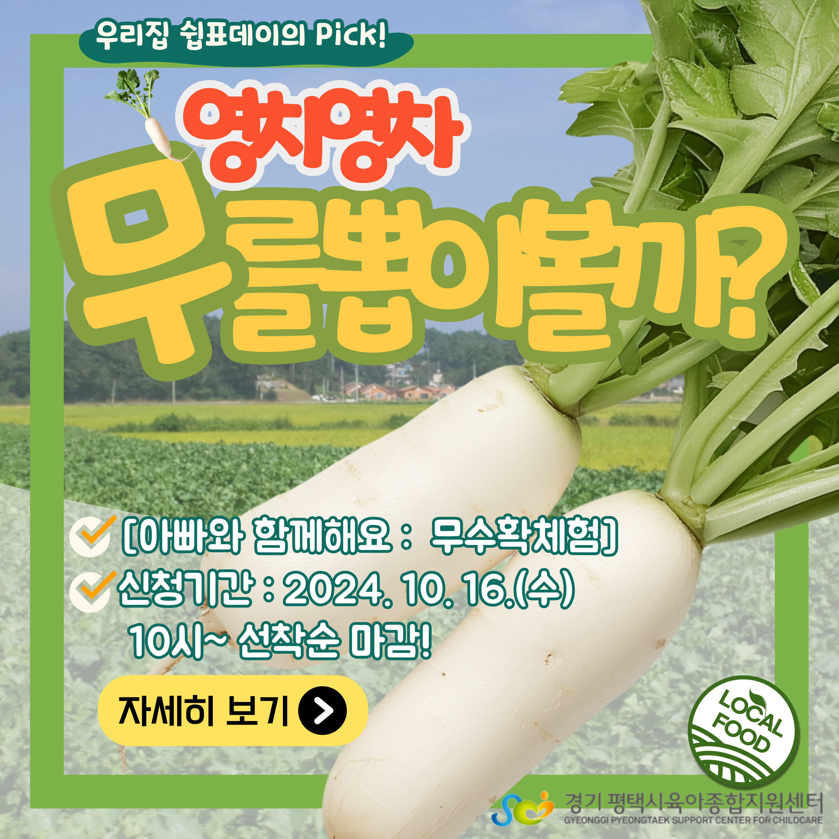 | *10. 16.(수)신청* [오/소] 아빠와 함께하는 우리가족 쉼표데이 '무를 뽑아볼까?' 모집 | |||||