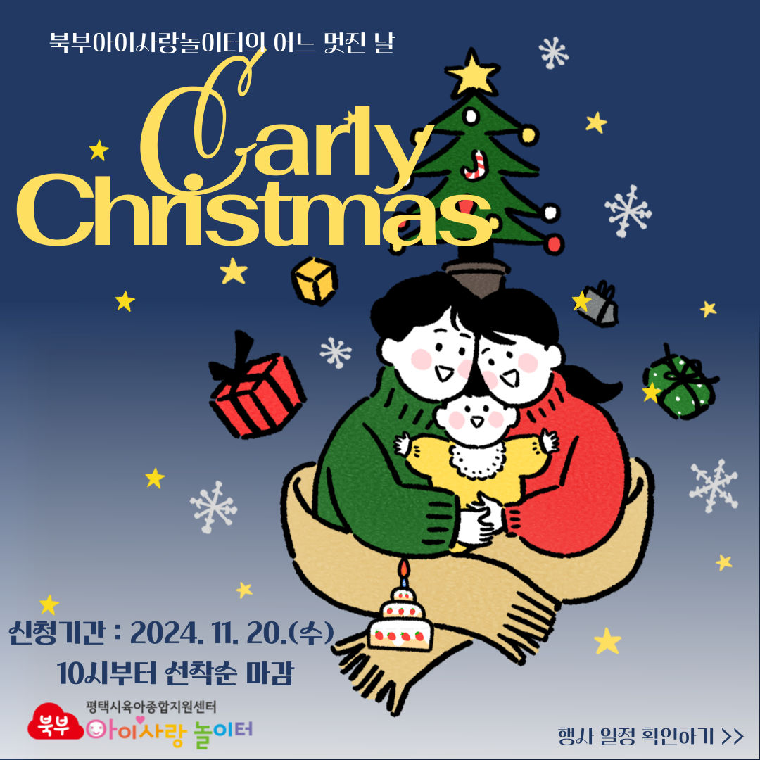 본 프로그램은 놀이체험실 대면 행사로 진행됩니다. 놀이체험실에서 진행되는 에어바운서 미끄럼틀, 빙어낚시, 눈꽃대포쏘기, 간식, 크리스마스 미니콘서트 공연(안내문에서 공연 일정 사전 확인) 등 행사가 준비되어 있으니 가족과 함께 참여해 주세요.