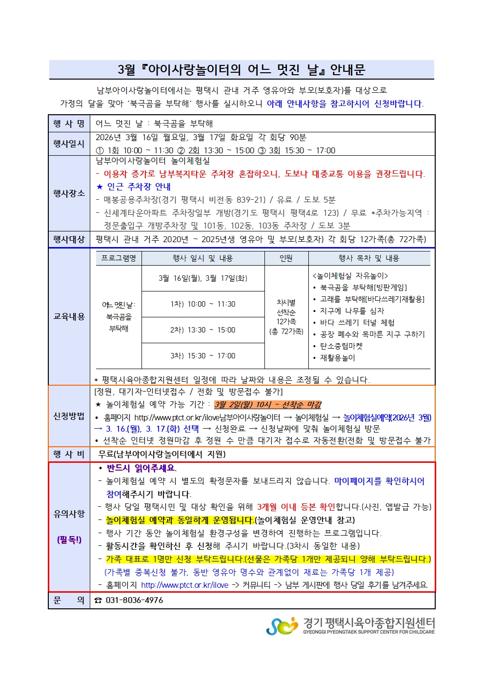 - 신청방법은 남부아이사랑놀이터 놀이체험실 예약방법과 동일하며, 3. 2.(월) 10:00부터 신청 가능합니다. (안내문 참고)