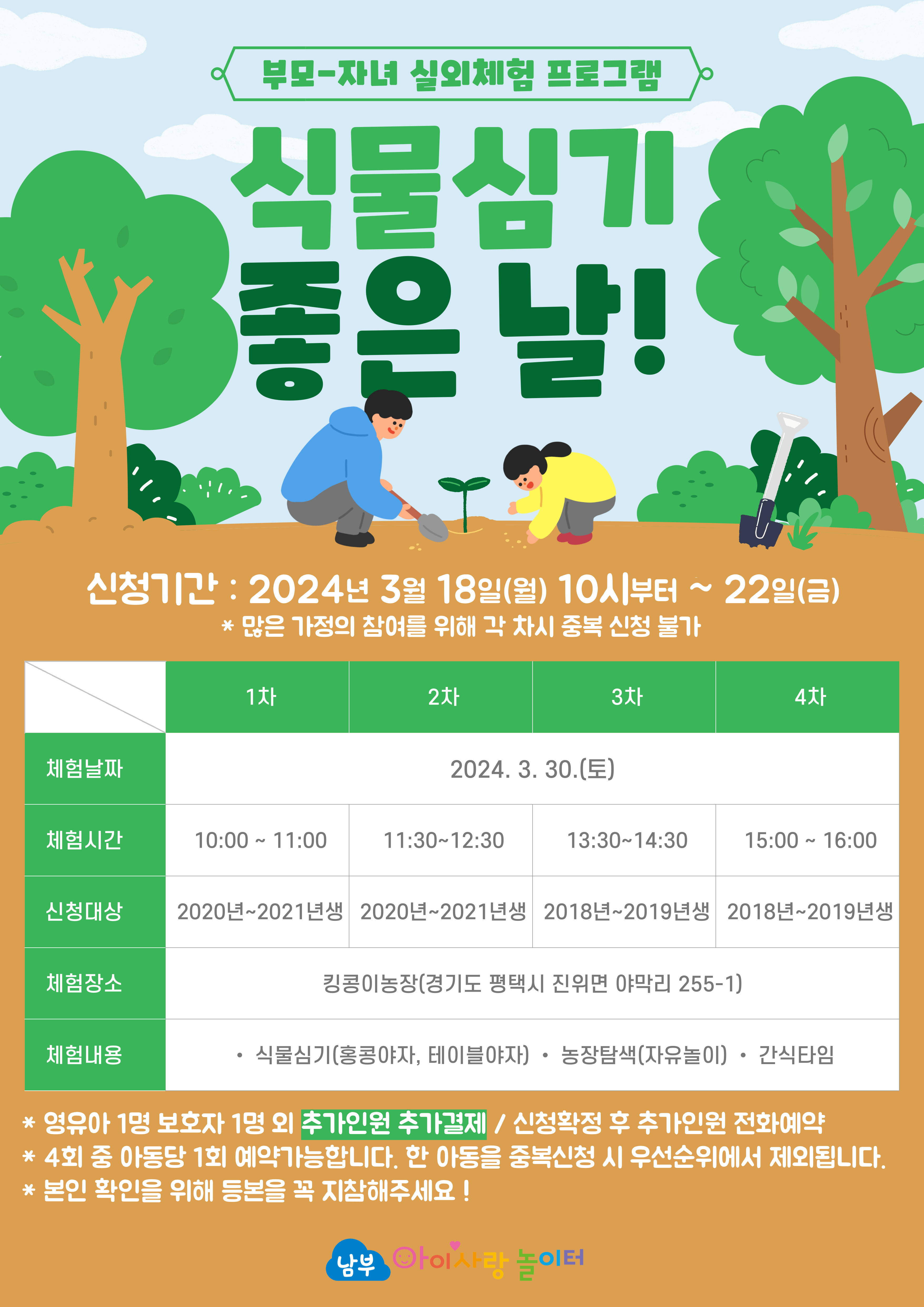 식물 심기 좋은날~!(평택 농장 탐방) 본 프로그램은 부모-자녀 실외체험 프로그램으로 2024년 3월 30일(토)에 진행됩니다. * 자세한 사항은 신청페이지 내 안내문을 참고해주시기 바랍니다.