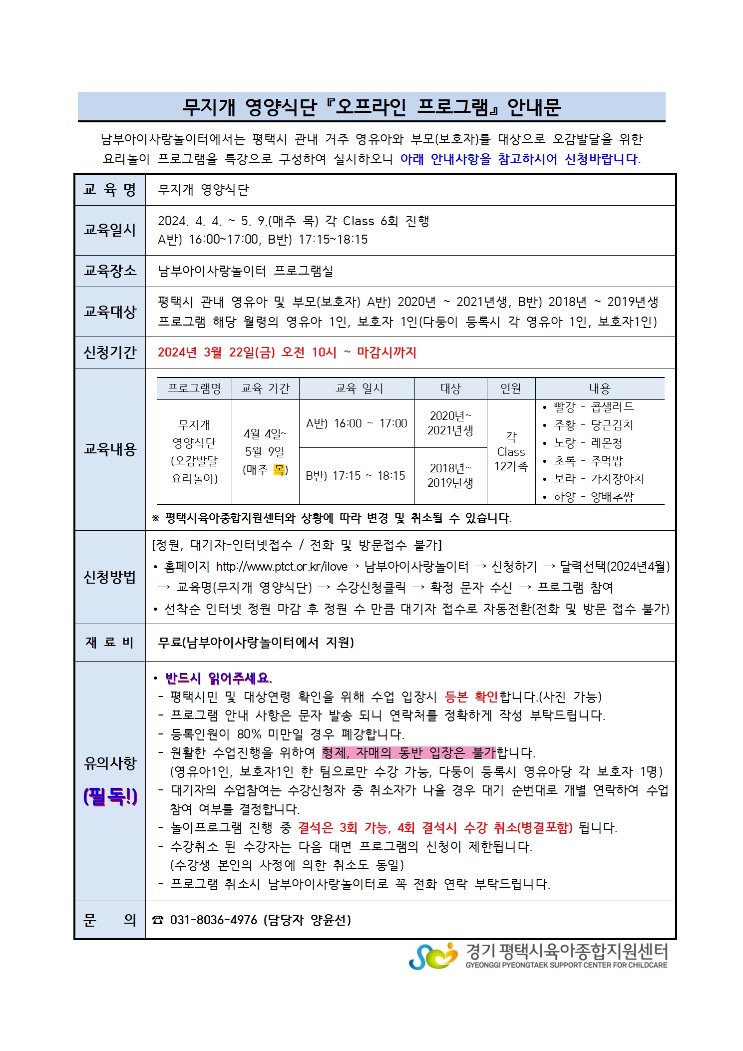 무지개 영양식단 A반 본 프로그램은 특강 오프라인 프로그램으로 남부아이사랑놀이터 프로그램실에서 진행됩니다. 4. 4.(목) ~ 5. 9.(목) 매주 목요일 6회차 프로그램으로 A반) 16:00~17:00(60분) / B반) 17:15~18:15 까지 진행됩니다. 2024년 3월 22일 금요일 오전 10:00부터 신청 가능 A반) http://www.ptct.or.kr/ilove/m2/sub5_view.asp?code=2&sn=614&datToday=2024-04-04 B반) http://www.ptct.or.kr/ilove/m2/sub5_view.asp?code=2&sn=615&datToday=2024-04-04