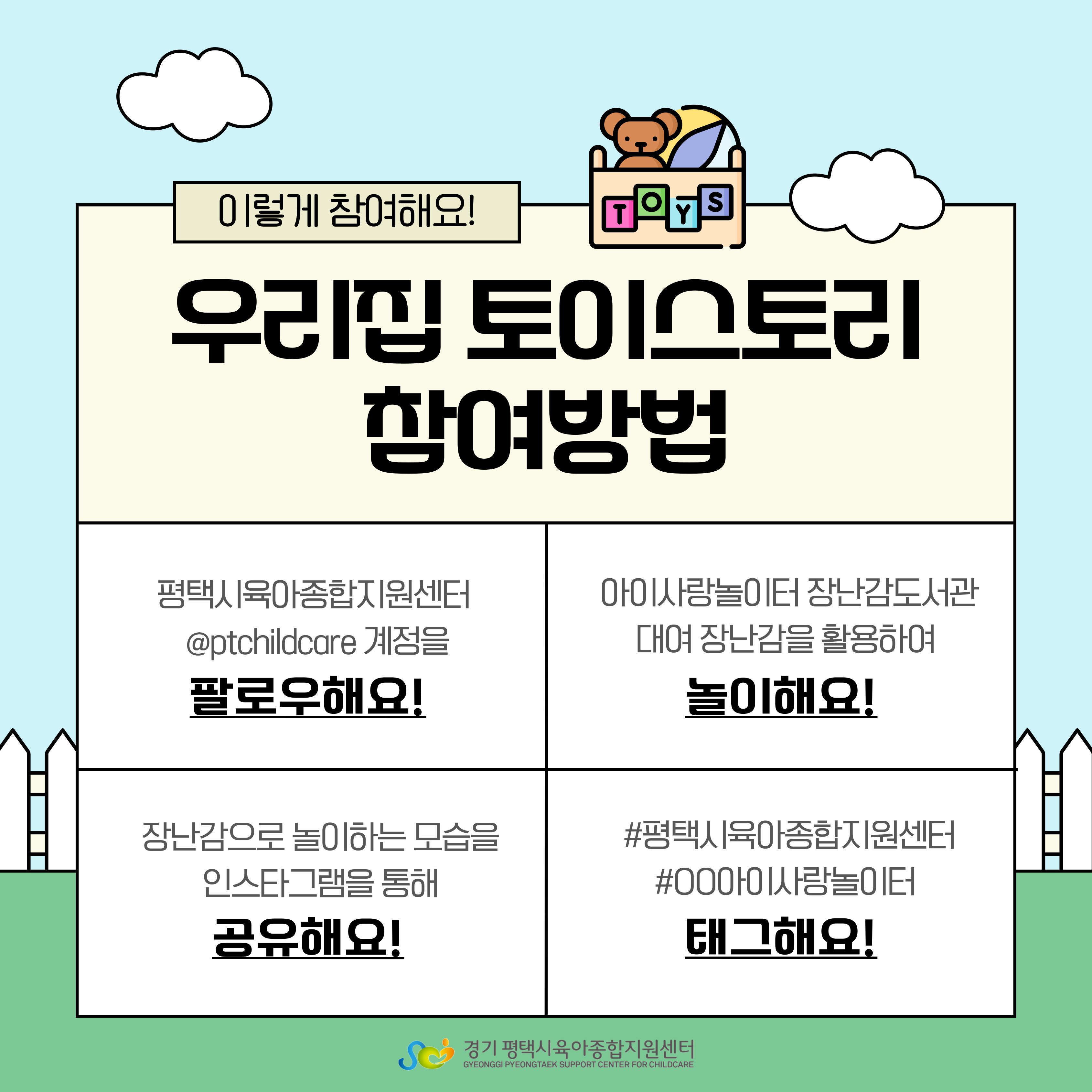 **참여 게시물은 평택시육아종합지원센터 계정(@ptchildcare) 내에 스토리 및 게시물로 공유되오니 이 점 참고 부탁드립니다.