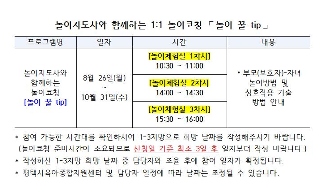 매월 초 평택시육아종합지원센터 인스타그램 및 홈페이지 놀이정보제공 게시판을 통해 공지 예정
