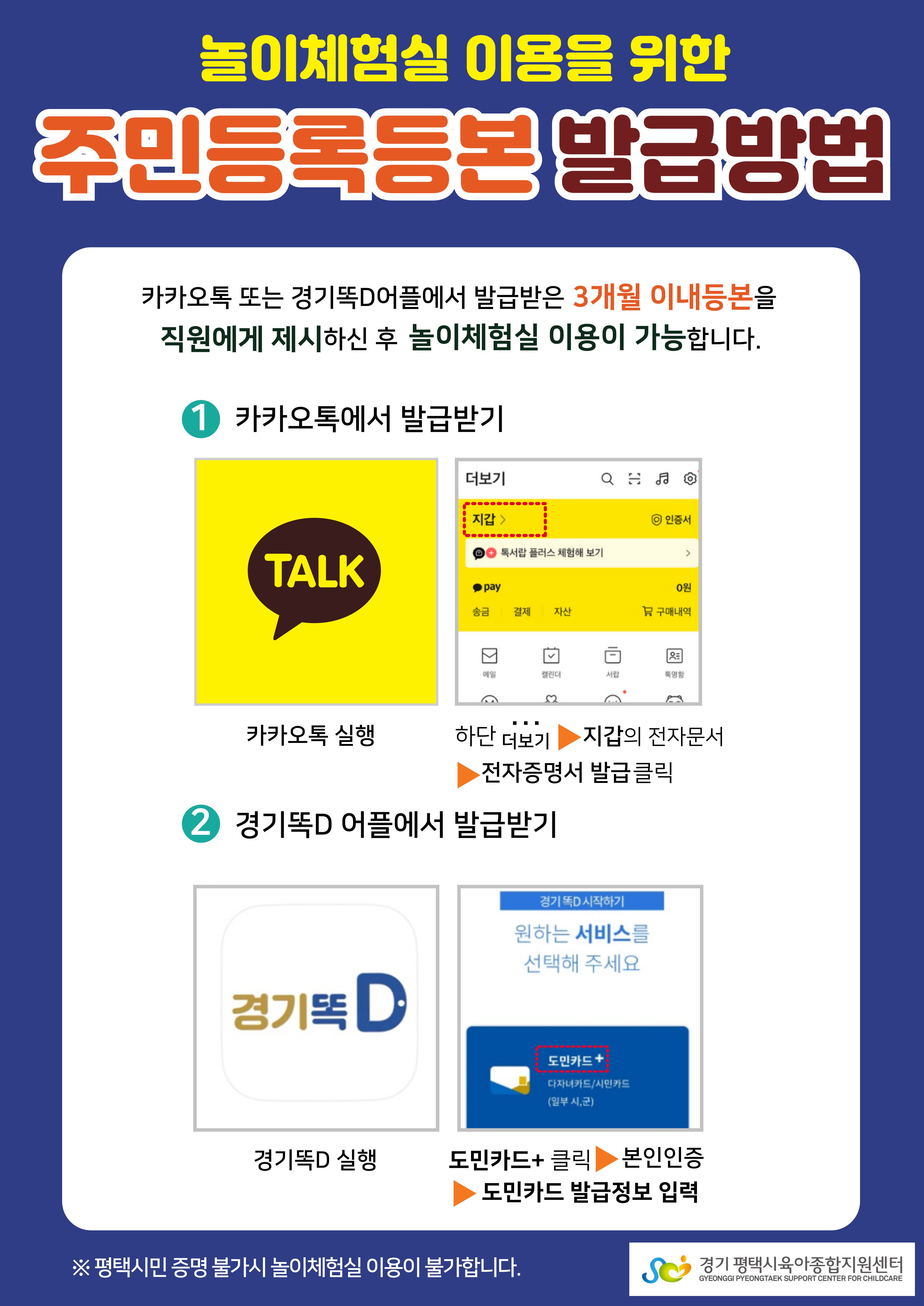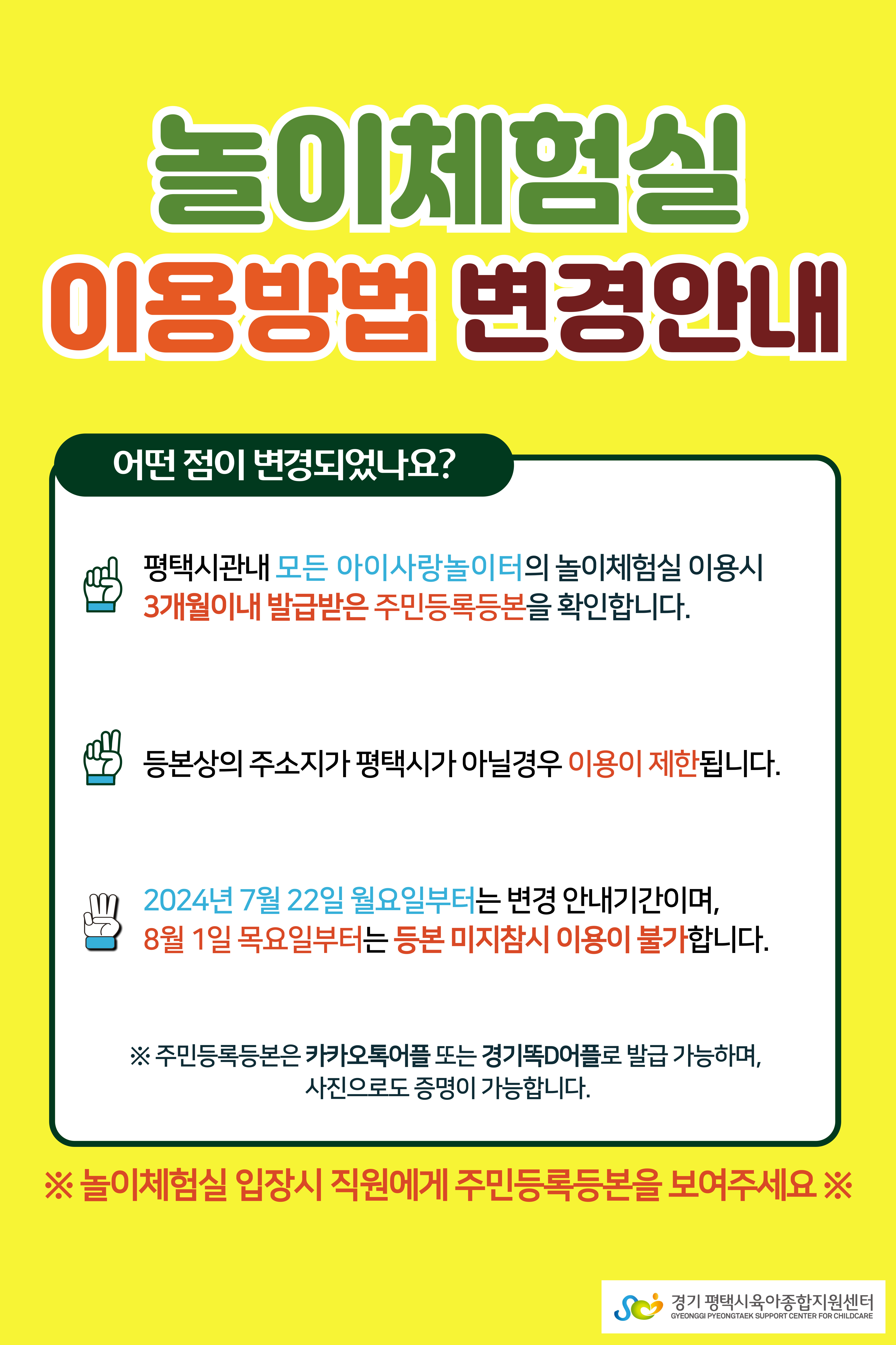 평택시 내 모든 아이사랑놀이터의 놀이체험실 이용방법이 2024년 7월 22일 월요일부터 변경기간 안내드립니다. 2024년 8월 1일 목요일부터는 등본(3개월이내) 미 지참시 이용이 불가한점 안내드립니다. 변경된 이용안내문을 참고하시어 이용에 차질 없으시길 바랍니다. 감사합니다.