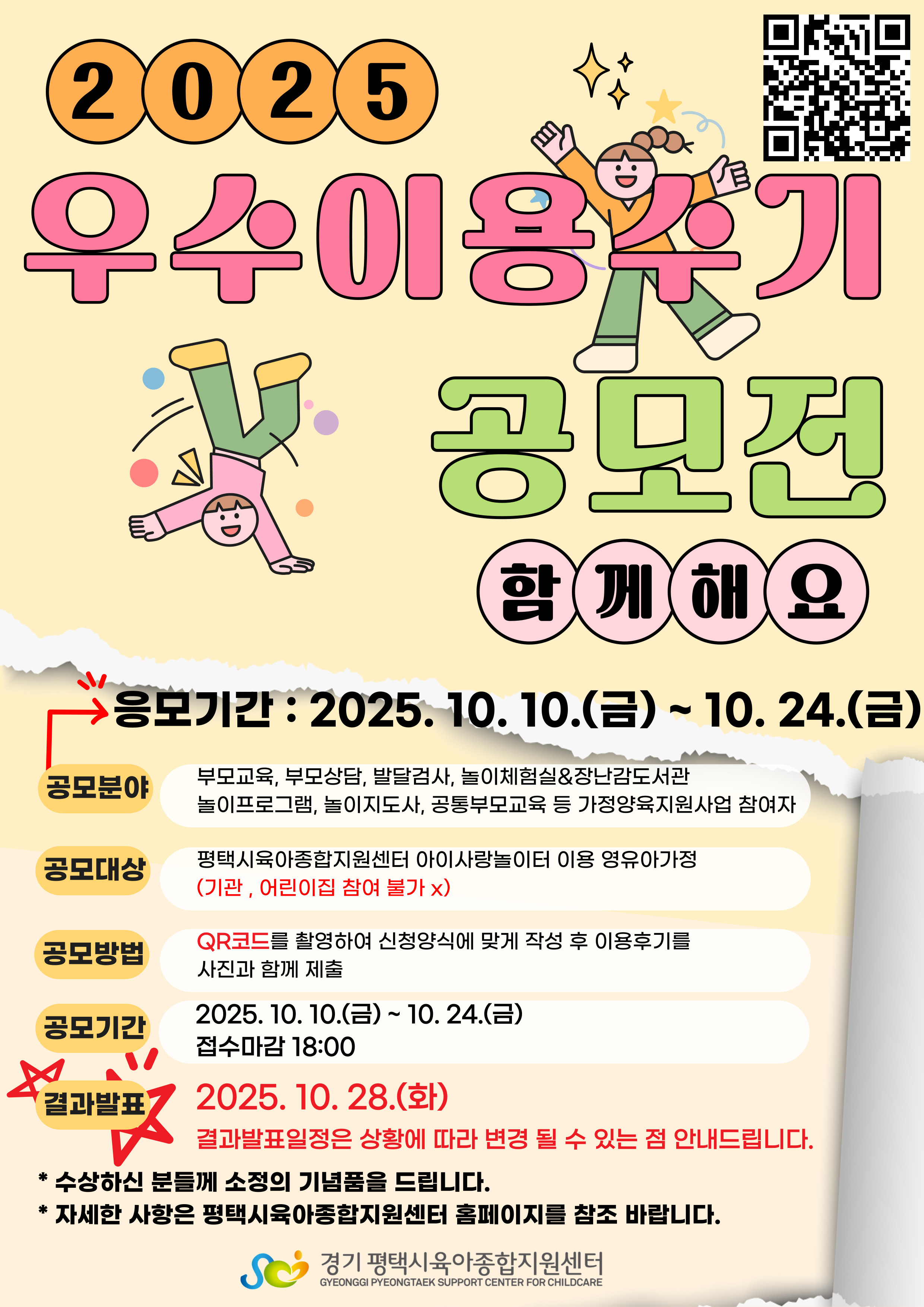 <2025년 우수 이용 수기 공모전> 평택시육아종합지원센터 아이사랑놀이터를 경험한 즐겁고 다양한 가족들의 이야기를 듣고자 '2025년 이용 수기 공모전'개최하고자 합니다. 많은 관심과 참여 부탁드립니다. ? ▶공모 대상: 평택시육아종합지원센터 아이사랑놀이터 이용 영유아가정 (기관·어린이집 참여불가) ▶공모 내용:부모교육/부모상담/발달검사/장난감대여서비스&놀이체험실, 놀이지도사 / 놀이프로그램 /공통부모교육 등 가정양육지원사업 참여자 ▶공모 일정:10월10일(금) ~ 10월24일(금) 18:00 접수마감 ▶공모 방법:하단에?안내된 링크 및 안내문의 QR코드로 접속하여 신청 양식에 맞게 작성 후 이용 후기사진과 함께 제출 ▶참여링크:2025 우수 이용 수기 공모전 링크<<클릭! ▶블로그 및 개인 SNS에 홍보 시 가산점 부여
