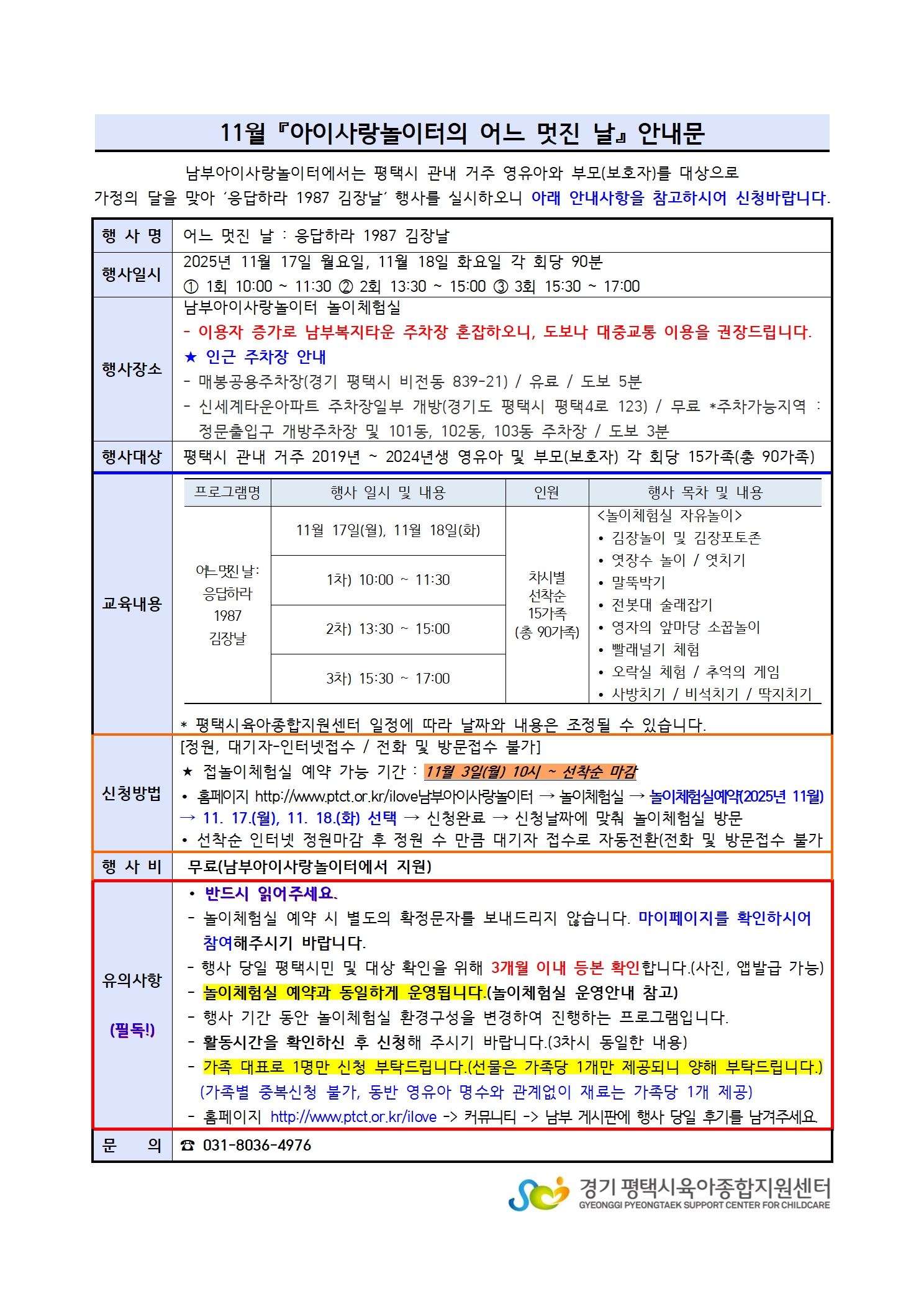 - 신청방법은 남부아이사랑놀이터 놀이체험실 예약방법과 동일하며, 11. 3.(월) 10:00부터 신청 가능합니다. (안내문 참고)