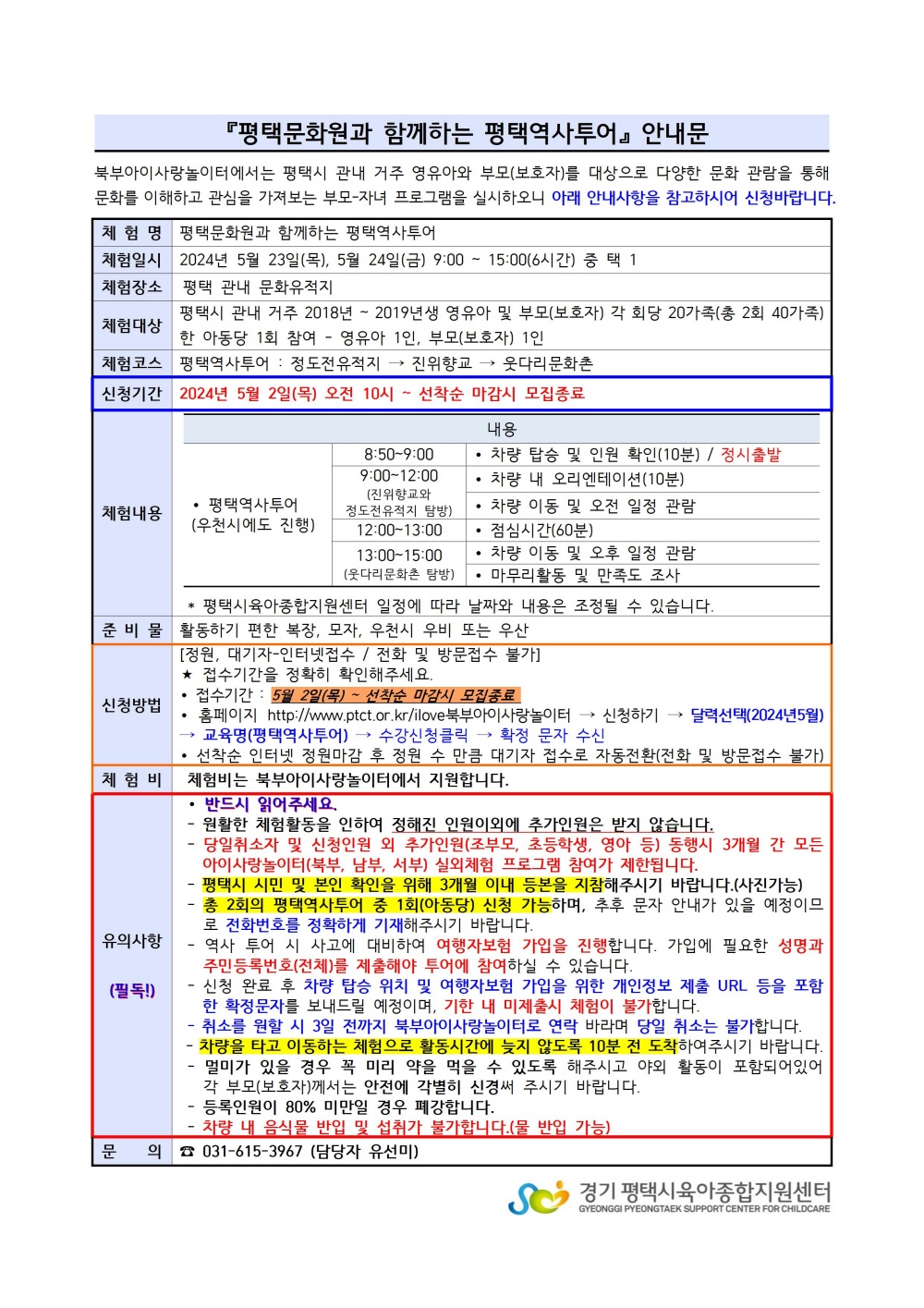 ※ 아래 내용을 꼭 읽어주세요 ! - 원활한 프로그램 진행을 위해 신청 인원이외에 추가인원은 받지 않습니다. - 총 2회의 평택역사투어 중 1회(아동당) 신청 가능하며, 추후 문자 안내가 있을 예정이므로 전화번호를 정확하게 기재해주시기 바랍니다. (신청 후 날짜 변경은 불가하니 꼭 확인 후 신청해 주시기 바랍니다.) - 평택 시민 및 본인 확인을 위해 3개월 이내 등본을 지참해주시기 바랍니다.(사진가능) - 역사 투어 시 사고에 대비하여 여행자보험 가입을 진행합니다. 가입에 필요한 성명과 주민등록번호(전체)를 제출해야 투어에 참여하실 수 있습니다.(차량 탑승 위치 및 여행자보험 가입을 위한 개인정보 제출 URL 등을 포함한 확정문자를 보내드릴 예정) - 취소를 원할 시 3일전까지 북부아이사랑놀이터로 연락하여 취소 처리하시기 바랍니다.(당일취소 불가) - 차량을 타고 이동하는 체험으로 활동시간에 늦지 않도록 10분 전 도착하여 주시기 바랍니다.(자차 주차비 미지원) - 단체로 이동하는 체험으로 ★정시출발(9시)★ 합니다. (주차 중, 거의 다왔다 등의 사유로 출발시간을 늦출 수 없습니다. 꼭! 10분전 도착 부탁드립니다.) - 멀미가 있을 경우 꼭 미리 약을 먹을 수 있도록 해주시고 야외활동이 포함되어 있어 각 부모(보호자)께서는 안전에 각별히 신경써 주시기 바랍니다. ** 그 외 유의사항은 안내문 참고