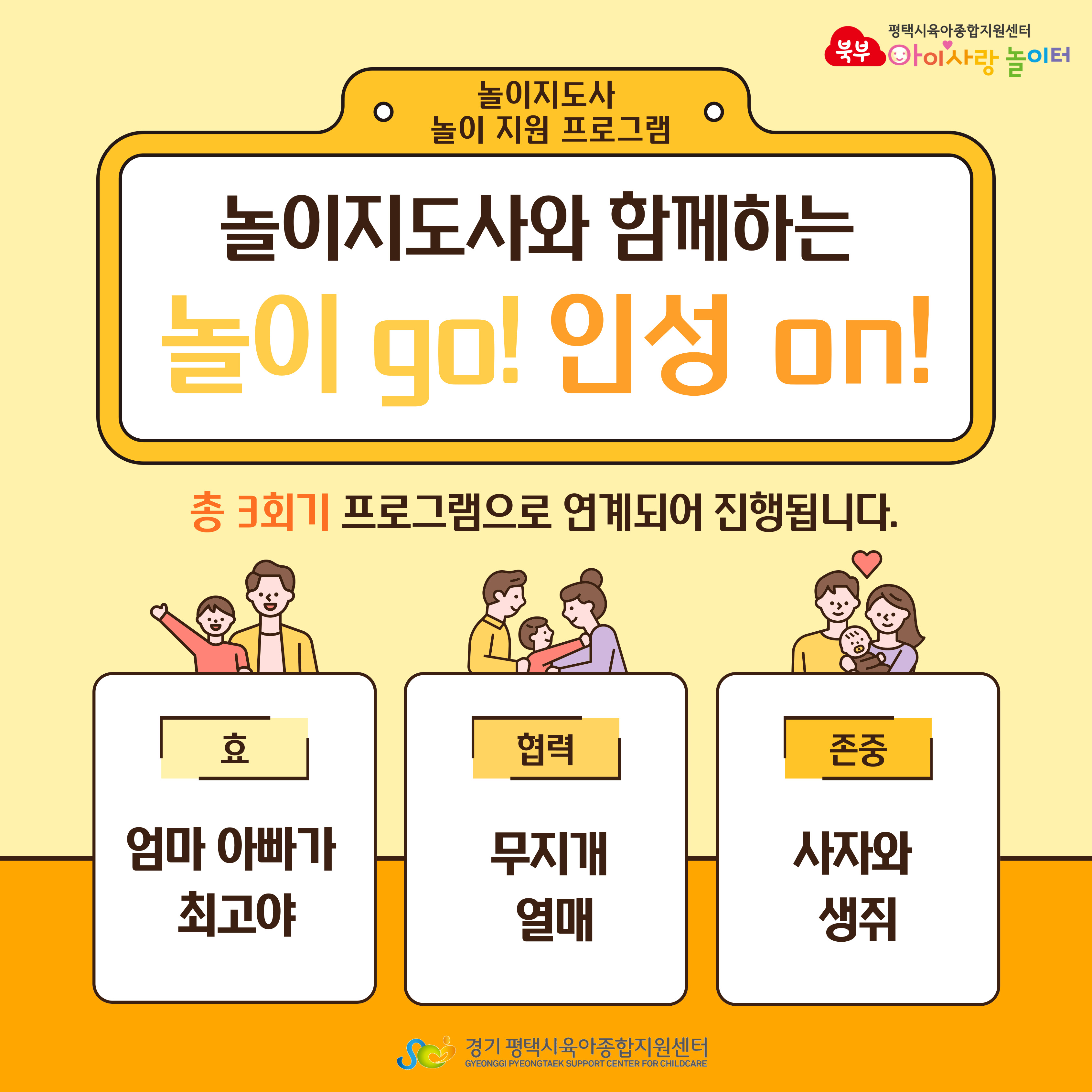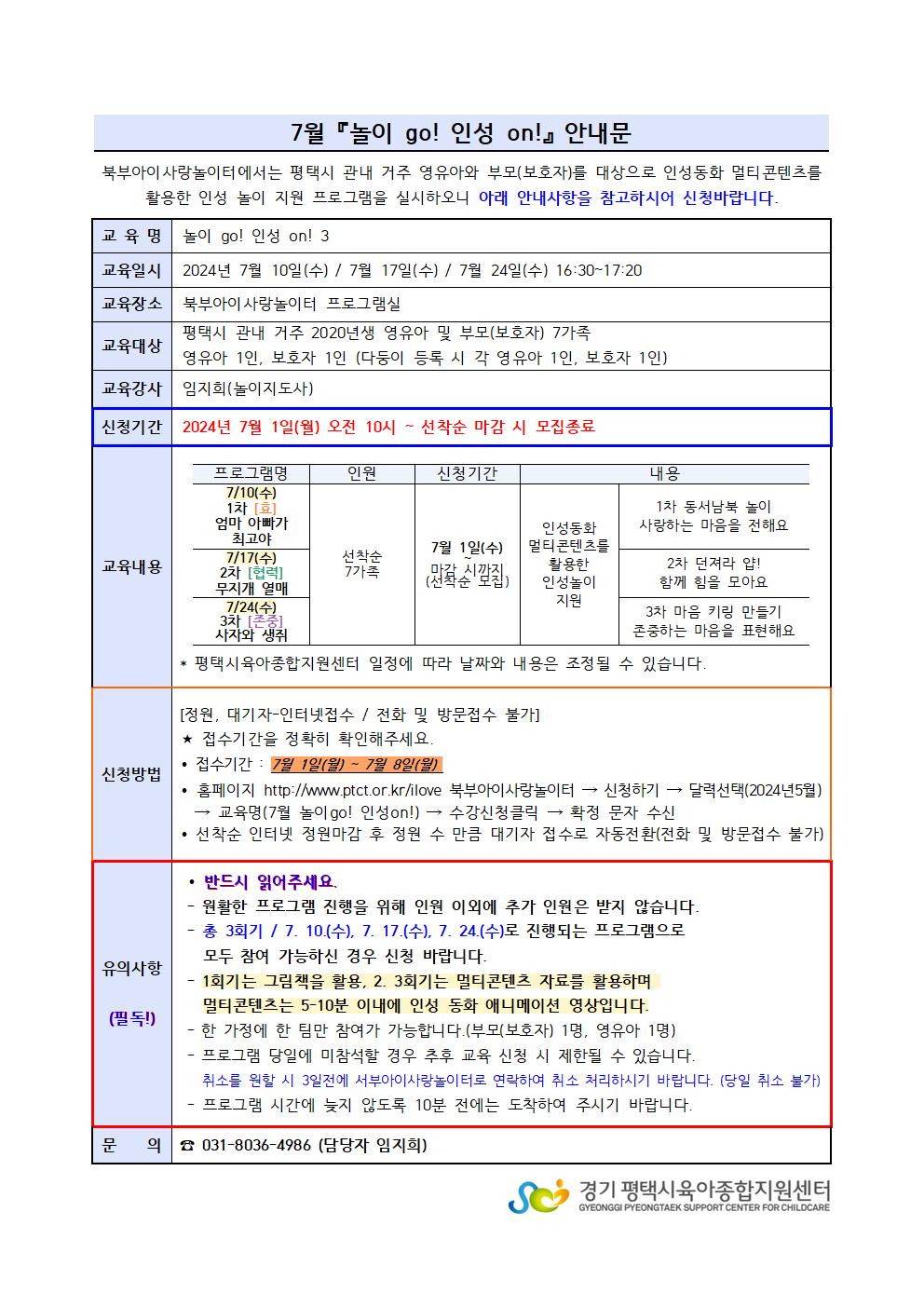 | 북부복지타운(송탄보건소) 내 이용자가 증가하여 주차장 이용이 어려울 수 있습니다.  도보나 대중교통을 이용하시어 방문해주시면 감사하겠습니다. * 근처 주차장 안내 : 이충레포츠공원주차장(경기도 평택시 장안웃길 149) / 도보 10분 놀이지도사와 함께하는 7월 놀이 go! 인성 on! 본 프로그램은 북부아이사랑놀이터 프로그램실에서 진행됩니다. 7월 10일(수) / 7월 17일(수) / 7월 24일(수) 총 3회차 프로그램으로  16:30~17:20 (50분)에 진행됩니다. ▶ 신청 대상 : 평택시 관내  2020년생 영유아 및 부모(보호자) 7가정 ▶ 신청 일시 : 7월 1일(월) 오전 10시 ~ 선착순 마감 ▶ 교육 일시 : 7월 10일(수) / 7월 17일(수) / 7월 24일(수) 16:30 ~ 17:20 ▶ 교육 내용 : 인성동화 멀티콘텐츠를 활용한 인성놀이 지원  ▶ 교육 장소 : 북부복지타운 4층 북부아이사랑놀이터 프로그램실  * * 반드시 읽어주세요 * * - 대상연령 확인을 위해 수업 입장 시 1회 등본 확인합니다. (사진 가능) - 프로그램 안내사항은 문자로 발송 되오니 연락처를 정확하게 작성 부탁드립니다. - 본 프로그램은 총 3회기 프로그램으로 부분참석이 불가하며, 모두 참여 가능하신 분만 신청 바랍니다. - 등록인원이 80% 미만일 경우 폐강합니다. - 원할한 수업진행을 위하여 형제, 자매의 동반 입장은 불가합니다.   (영유아 1인, 보호자 1인 한 팀으로만 수강 가능, 다둥이 등록 시 영유아당 각 보호자 1명) - 대기자의 수업참여는 수강신청자 중 취소자가 나올 경우 대기 순번대로 개별 연락하여 수업 참여 여부를 결정합니다. - 당일 취소할 경우 추후 교육 신청 시 제한 될 수 있습니다.   취소를 원할 시 아래 문의 번호로 3일 전까지 연락하여 취소 처리하시기 바랍니다. (당일 취소 불가) 문의: 031-8036-4986     | |||