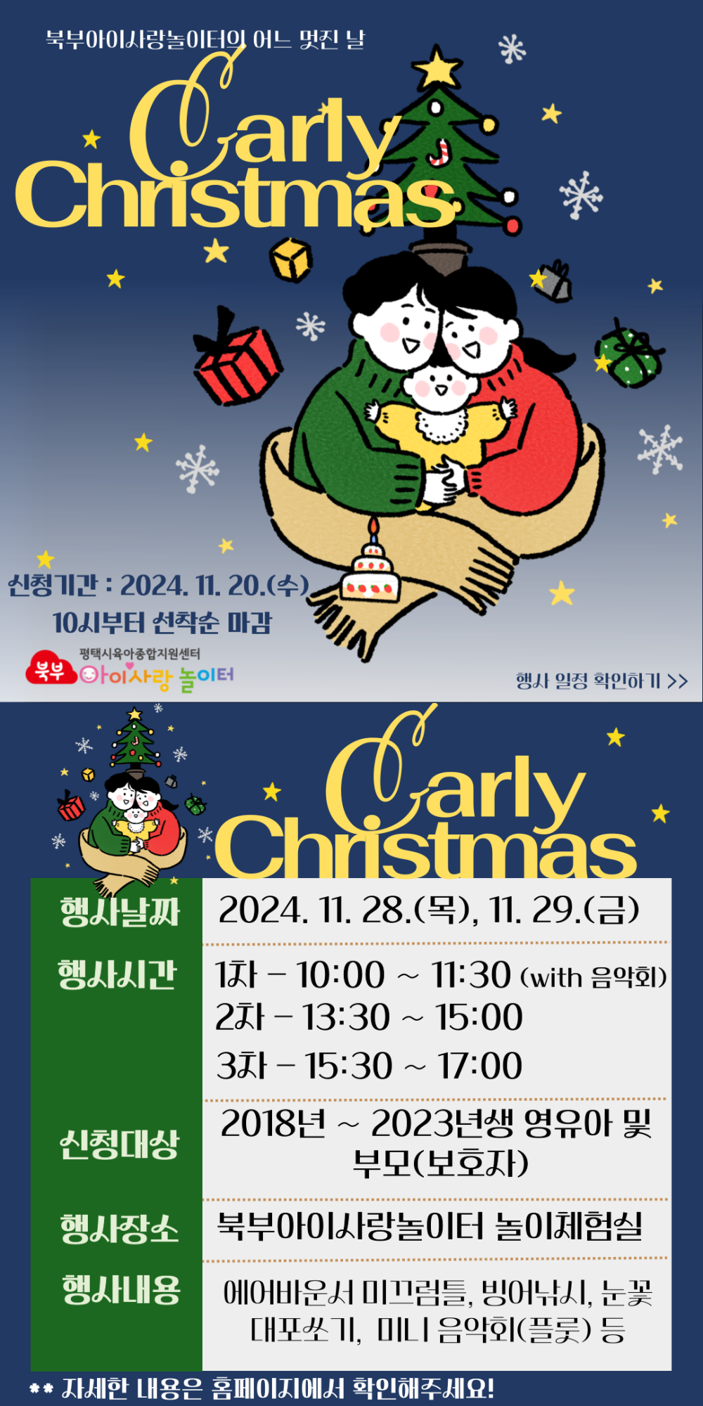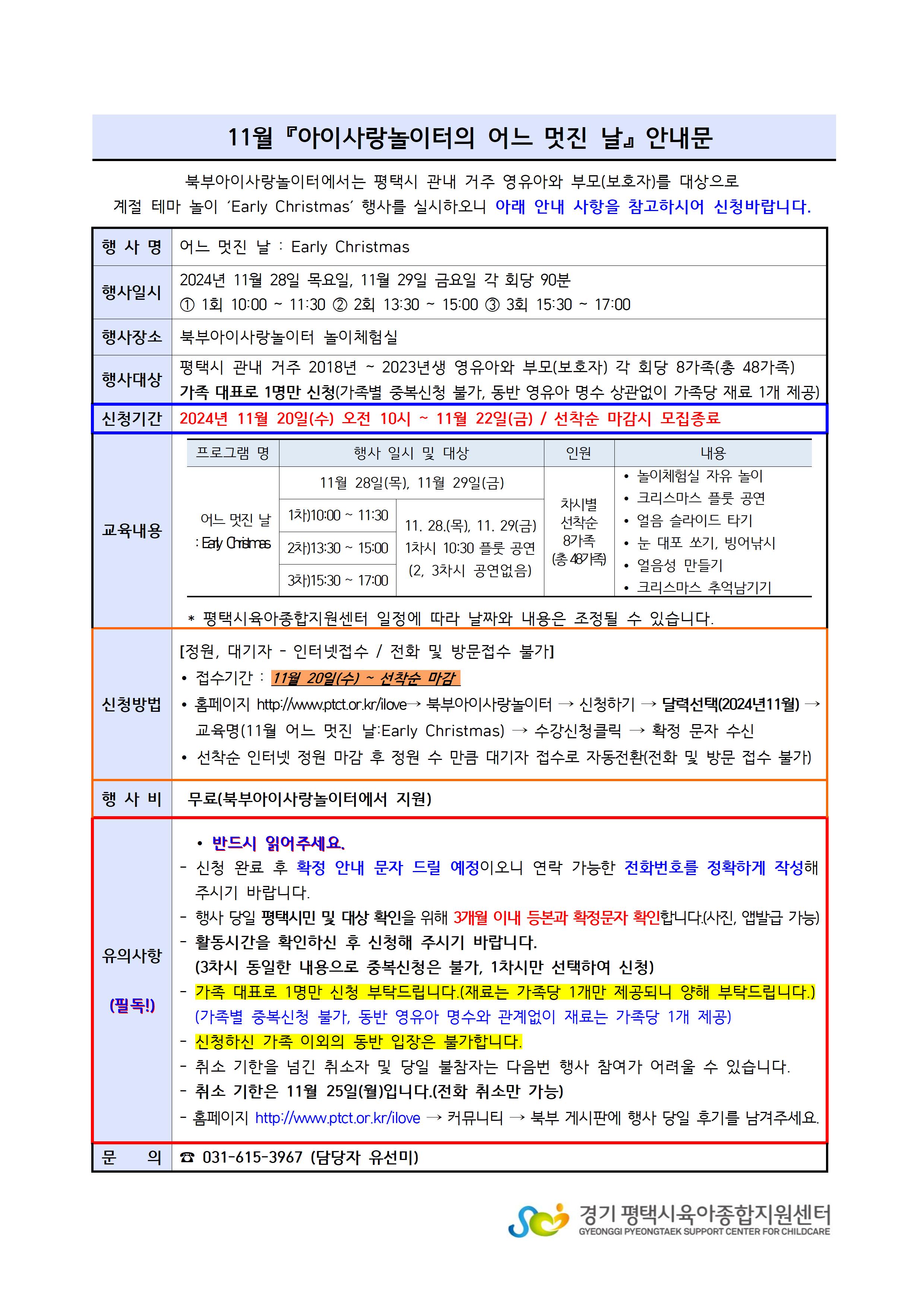 북부복지타운(송탄보건소) 내 이용자가 증가하여 주차장 이용이 어려울 수 있습니다. 도보나 대중교통을 이용하시어 방문해주시면 감사하겠습니다. * 근처 주차장 안내 : 이충레포츠공원주차장(경기도 평택시 장안웃길 149) / 도보 10분 어느 멋진 날 : Early Christmas (3차시) 본 프로그램은 놀이체험실 대면 행사로 2024년 11월 28일(목) 15:30~17:00에 진행됩니다. 놀이체험실에서 진행되는 에어바운서 미끄럼틀, 빙어낚시, 눈꽃대포쏘기, 간식, 크리스마스 미니콘서트 공연(안내문에서 공연 일정 사전 확인) 등 행사가 준비되어 있으니 가족과 함께 참여해 주세요.