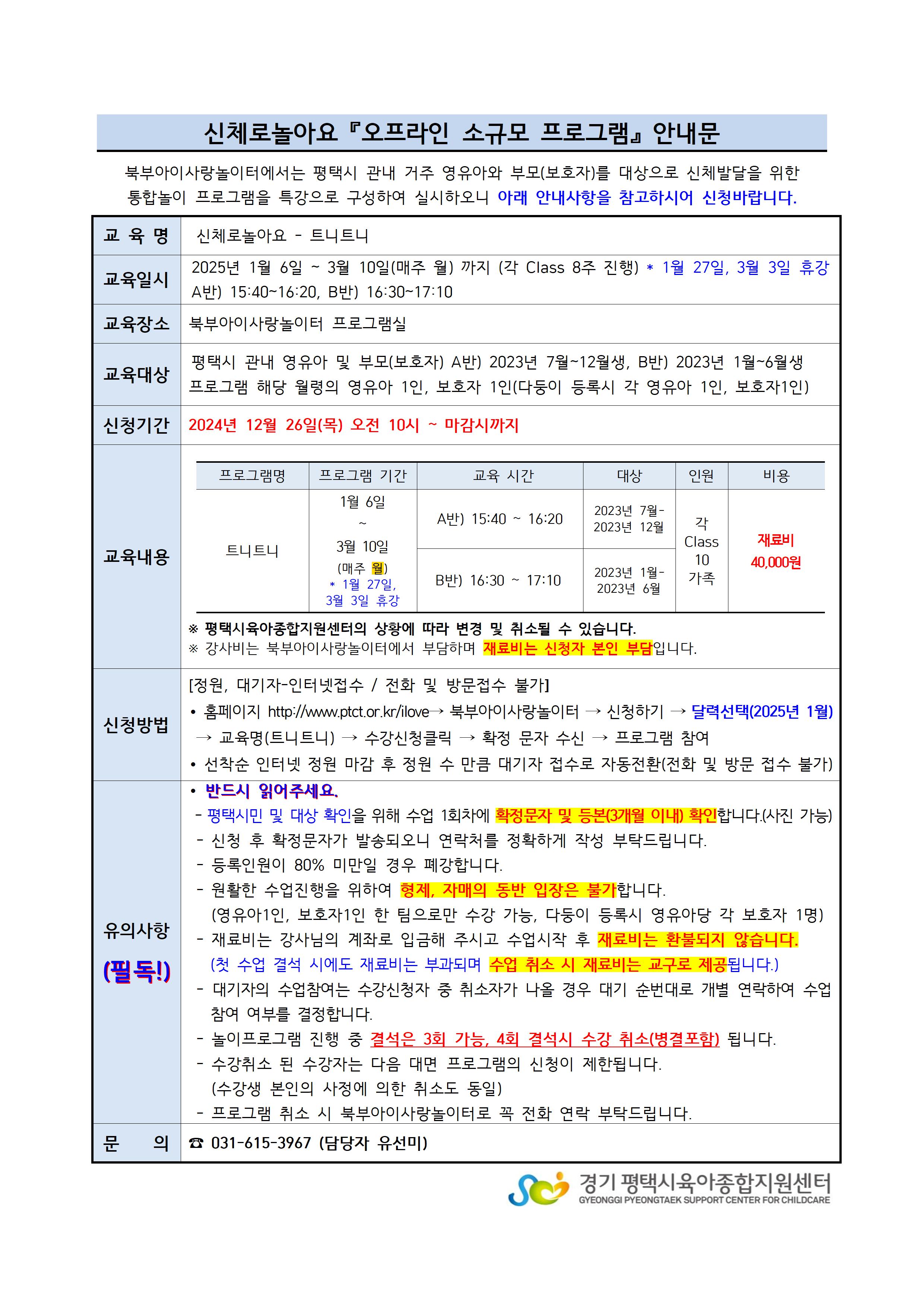 * * 반드시 읽어주세요 * * - 평택시 시민 및 대상 확인을 위해 수업 1회차에 확정문자 및 3개월 이내 등본 확인합니다.(사진 가능) - 신청 확정 시 확정문자가 발송되오니 연락처를 정확하게 작성 부탁드립니다.(프로그램 안내사항 포함) - 등록인원이 80% 미만일 경우 폐강합니다. - 원활한 수업진행을 위하여 형제, 자매의 동반 입장은 불가합니다. (영유아1인, 보호자1인 한 팀으로만 수강 가능, 다둥이 등록시 영유아당 각 보호자 1명) - 재료비는 강사님의 계좌로 입금해 주시고 수업시작 후 재료비는 환불되지 않습니다. (첫 수강시 안내드리는 강사님 계좌로 납부 부탁드리며 첫 수업 결석시 및 수업 결석시에도 재료비는 부과됩니다.) - 대기자의 수업참여는 수강신청자 중 취소자가 나올 경우 대기 순번대로 개별 연락하여 수업 참여 여부를 결정합니다. - 놀이프로그램 진행 중 결석은 3회 가능, 4회 결석시 수강 취소(병결포함) 됩니다. - 수강취소 된 수강자는 다음 대면 프로그램의 신청이 제한됩니다.(수강생 본인의 사정에 의한 취소도 동일) - 프로그램 취소시 북부아이사랑놀이터로 꼭 전화 연락 부탁드립니다.