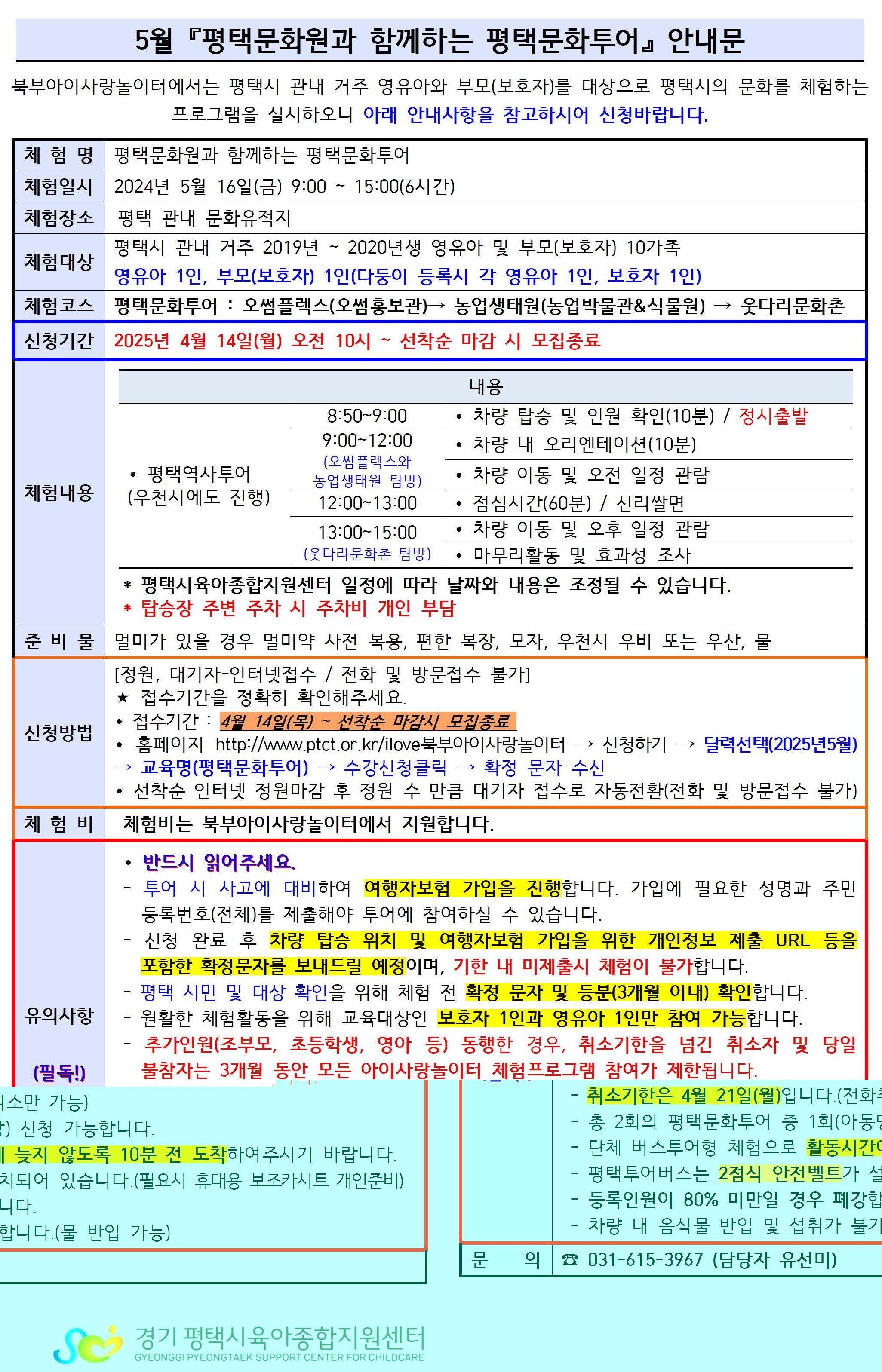 - 4월, 5월 평택문화투어 중복신청 불가(총 2회 중 1회 선택) - 신청 후 확정문자를 받으신 분만 확정이 완료되오니 유의해주시기 바랍니다.(전화 안내 없음) - 투어형 프로그램으로 여행자보험을 가입해야합니다. 아래 첨부된 안내문 내용을 확인하시기 바랍니다.