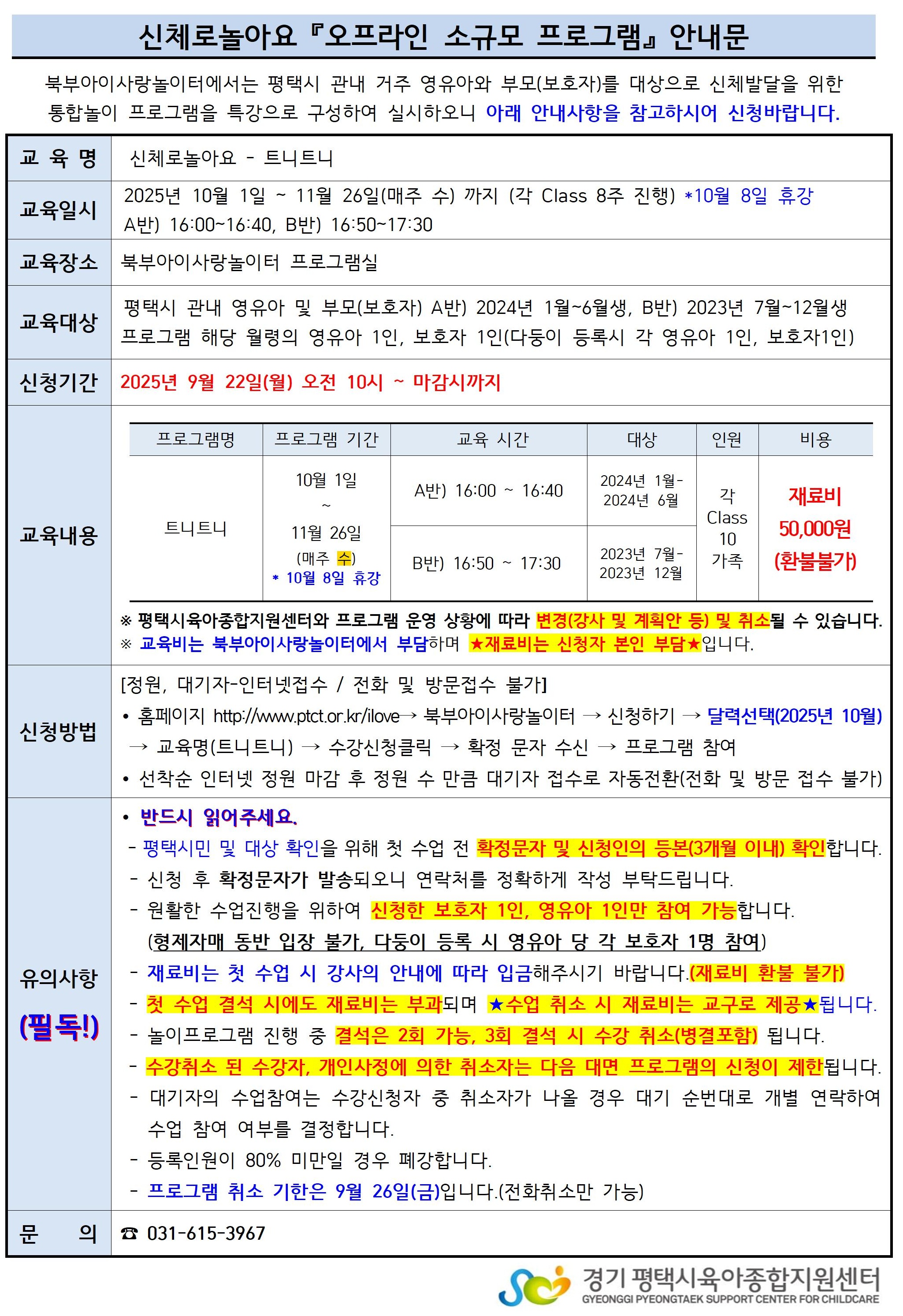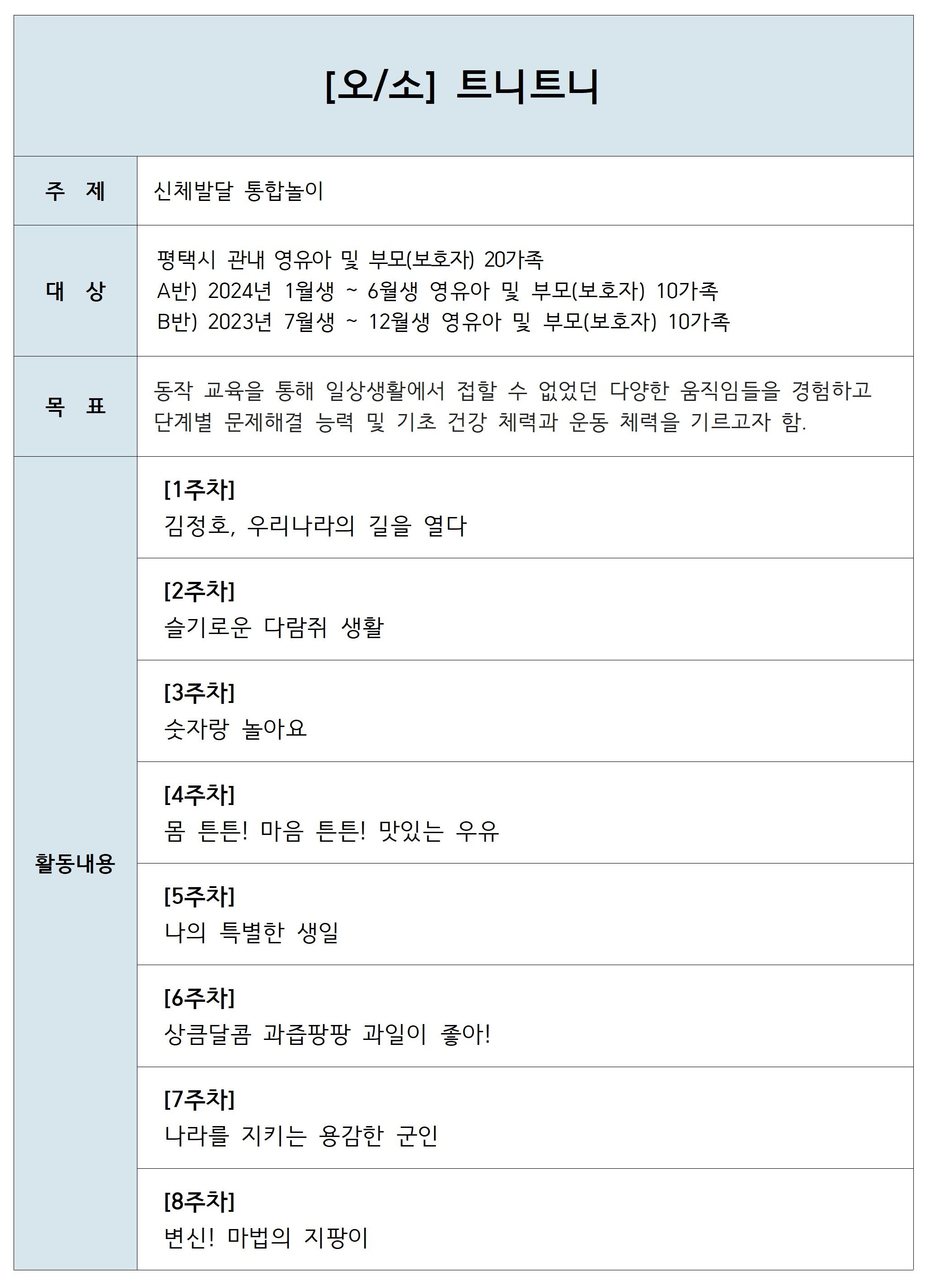 - 동일 아이디로 다둥이 신청 불가하며, 동일 아이디 신청 시 취소 처리됩니다. (ex 다둥이 등록시 어머님ID-아이1명, 아버님ID-아이1명) - 트니트니는 개인 부담 재료비가 발생되며, 교육일정 및 결석 등 관련된 사항은 아래의 안내문에서 확인바랍니다.(안내문 정독 권장) - 신청 후 확정문자를 받으신 분만 확정이 완료되오니 유의해주시기 바랍니다.