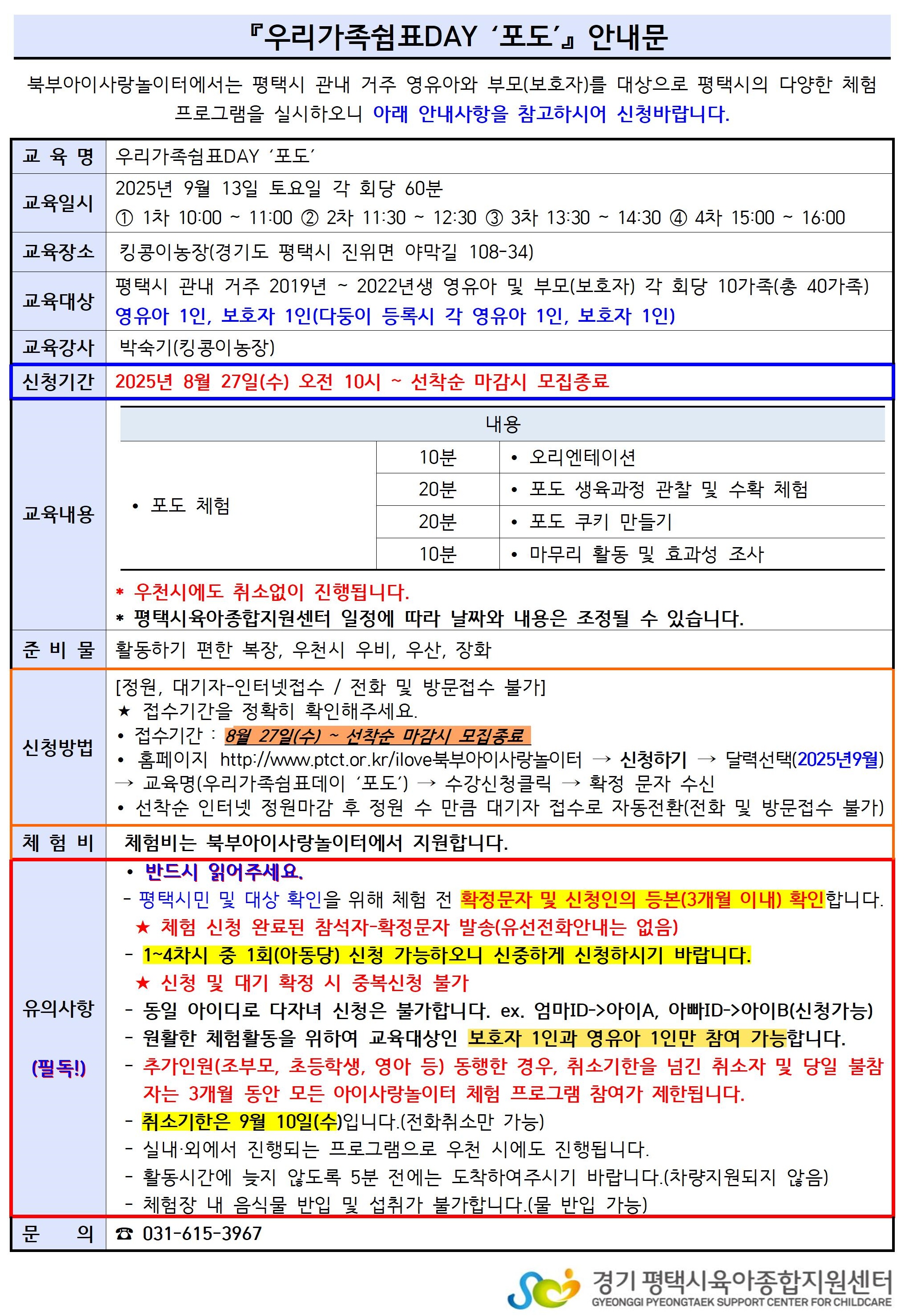 | 접수대상 | 2019년 ~ 2022년생 영유아 및 부모(보호자) 10가족 | ||