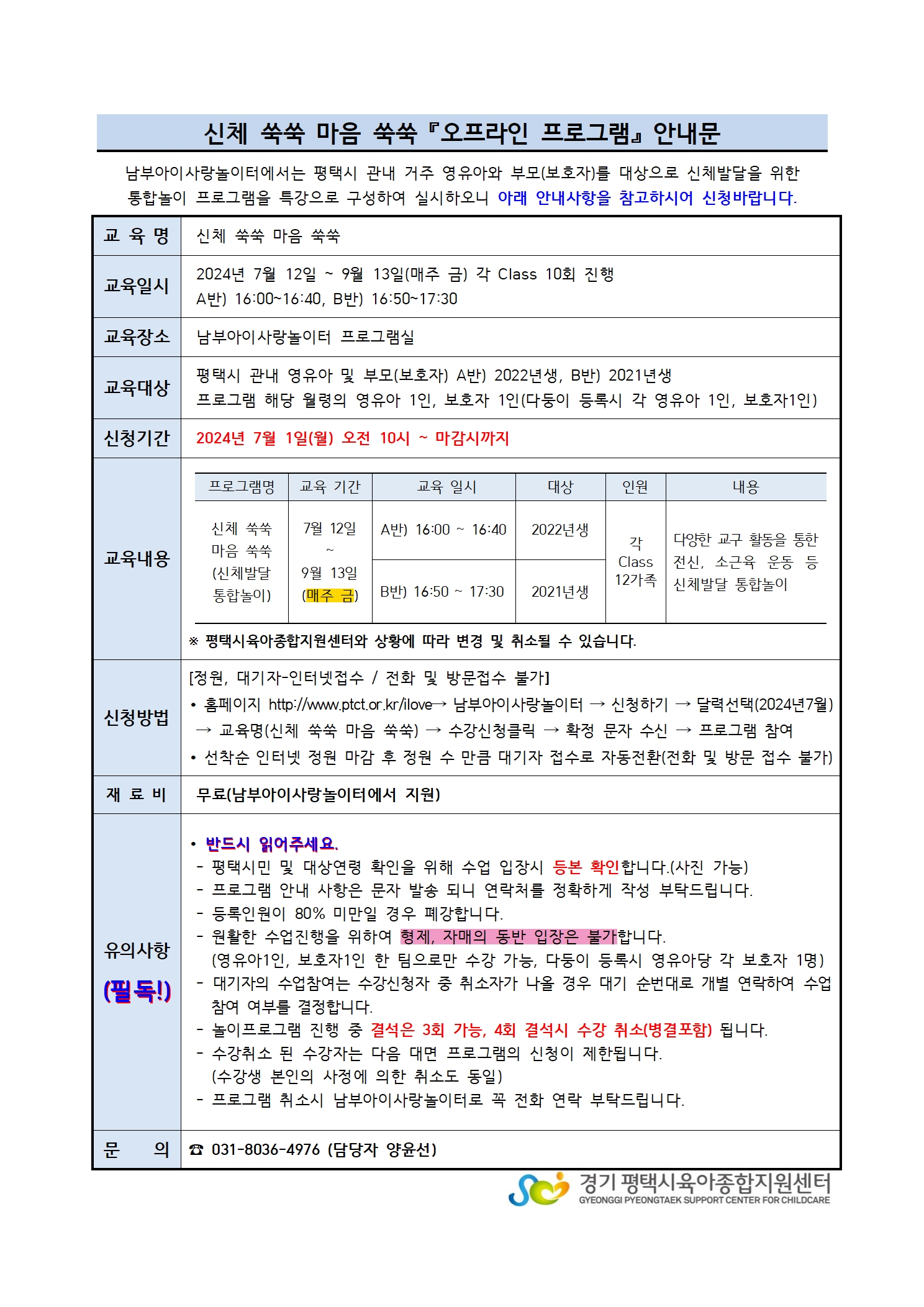 * * 반드시 읽어주세요 * * - 평택시 시민 및 대상연령 확인을 위해 수업 1회차에 3개월 이내 등본 확인합니다.(사진 가능) - 프로그램 안내 사항은 문자 발송 되니 연락처를 정확하게 작성 부탁드립니다. - 등록인원이 80% 미만일 경우 폐강합니다. - 원활한 수업진행을 위하여 형제, 자매의 동반 입장은 불가합니다. (영유아1인, 보호자1인 한 팀으로만 수강 가능, 다둥이 등록시 영유아당 각 보호자 1명) - 대기자의 수업참여는 수강신청자 중 취소자가 나올 경우 대기 순번대로 개별 연락하여 수업 참여 여부를 결정합니다. - 놀이프로그램 진행 중 결석은 3회 가능, 4회 결석시 수강 취소(병결포함) 됩니다. - 수강취소 된 수강자는 다음 대면 프로그램의 신청이 제한됩니다. (수강생 본인의 사정에 의한 취소도 동일) - 프로그램 취소시 남부아이사랑놀이터로 꼭 전화 연락 부탁드립니다.