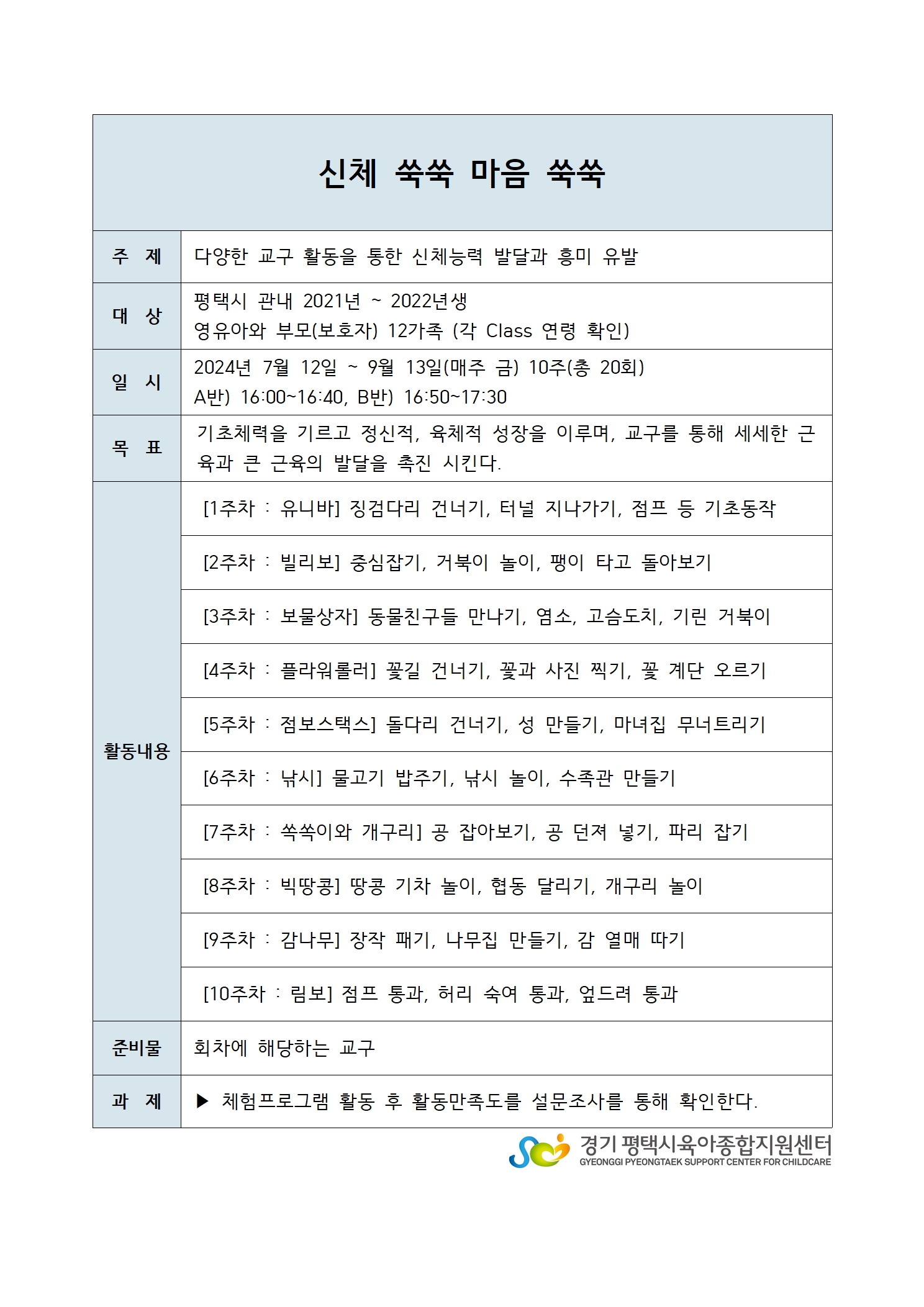신체 쑥쑥 마음 쑥쑥 A반 본 프로그램은 특강 오프라인 프로그램으로 남부아이사랑놀이터 프로그램실에서 진행됩니다. 7. 12.~9. 13.(매주 금) 까지 총 10회차 프로그램으로 16:00~16:40(40분)까지 진행됩니다.