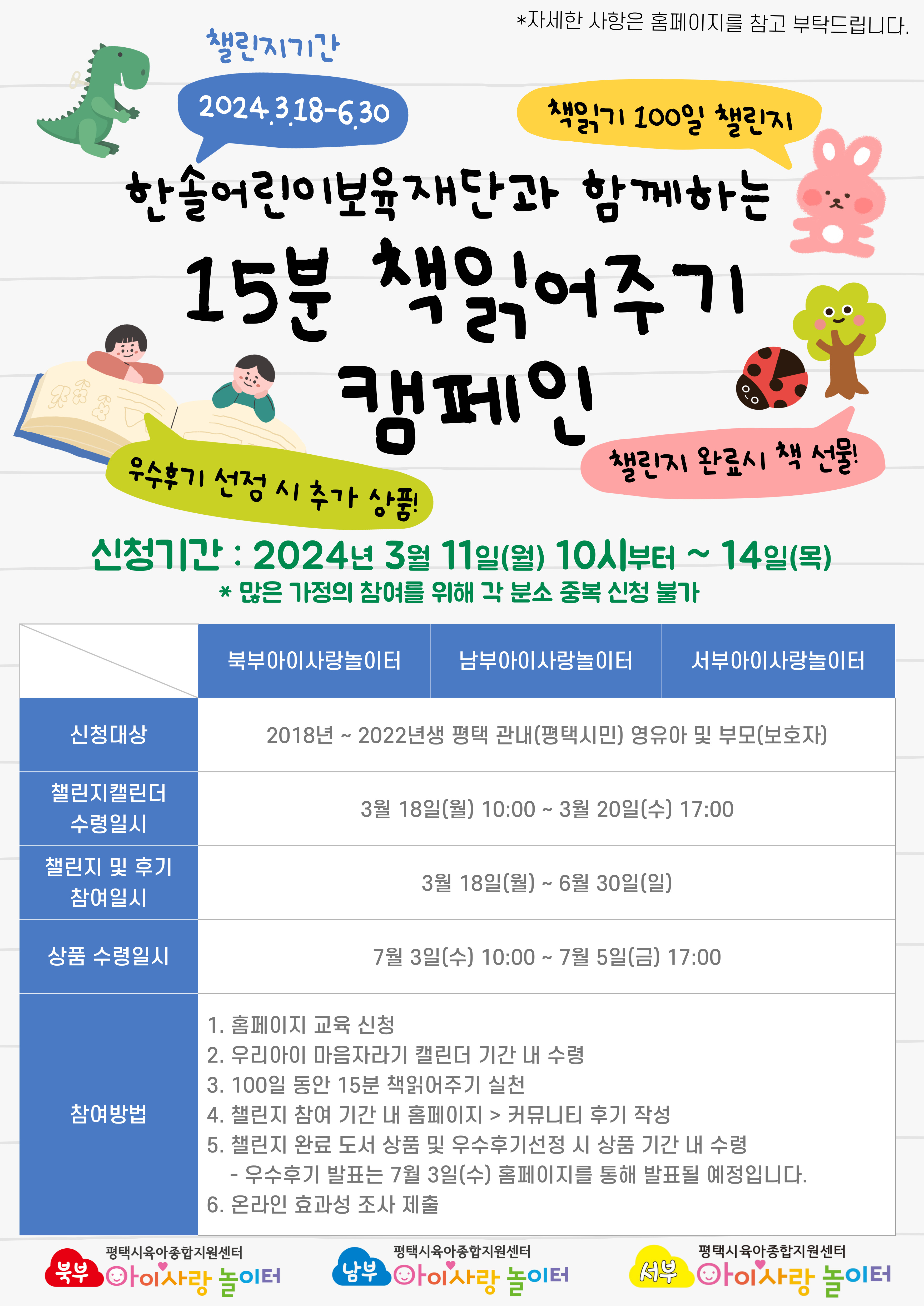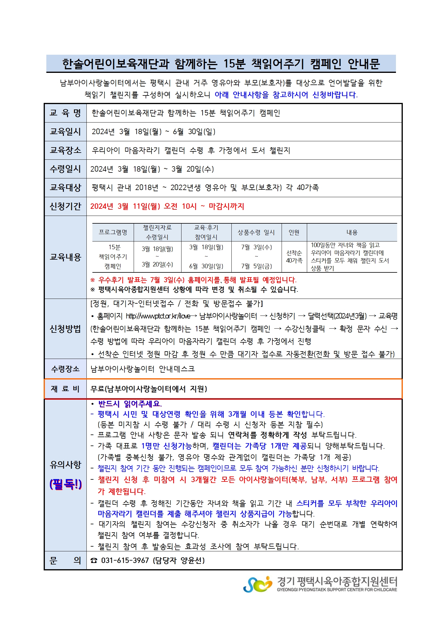 본 프로그램은 비대면 행사로 2024년 3월 18일(월) ~ 6월 30일(일)까지 진행됩니다. 부모와 아이가 책을 읽으며 나누는 긍정적 교감과 인지능력 및 언어 발달을 돕고자 한솔어린이재단과 함께 15분 책읽어주기 캠페인을 진행하고자 합니다. 아래의 내용을 확인하신 후 참여해 부탁드립니다.