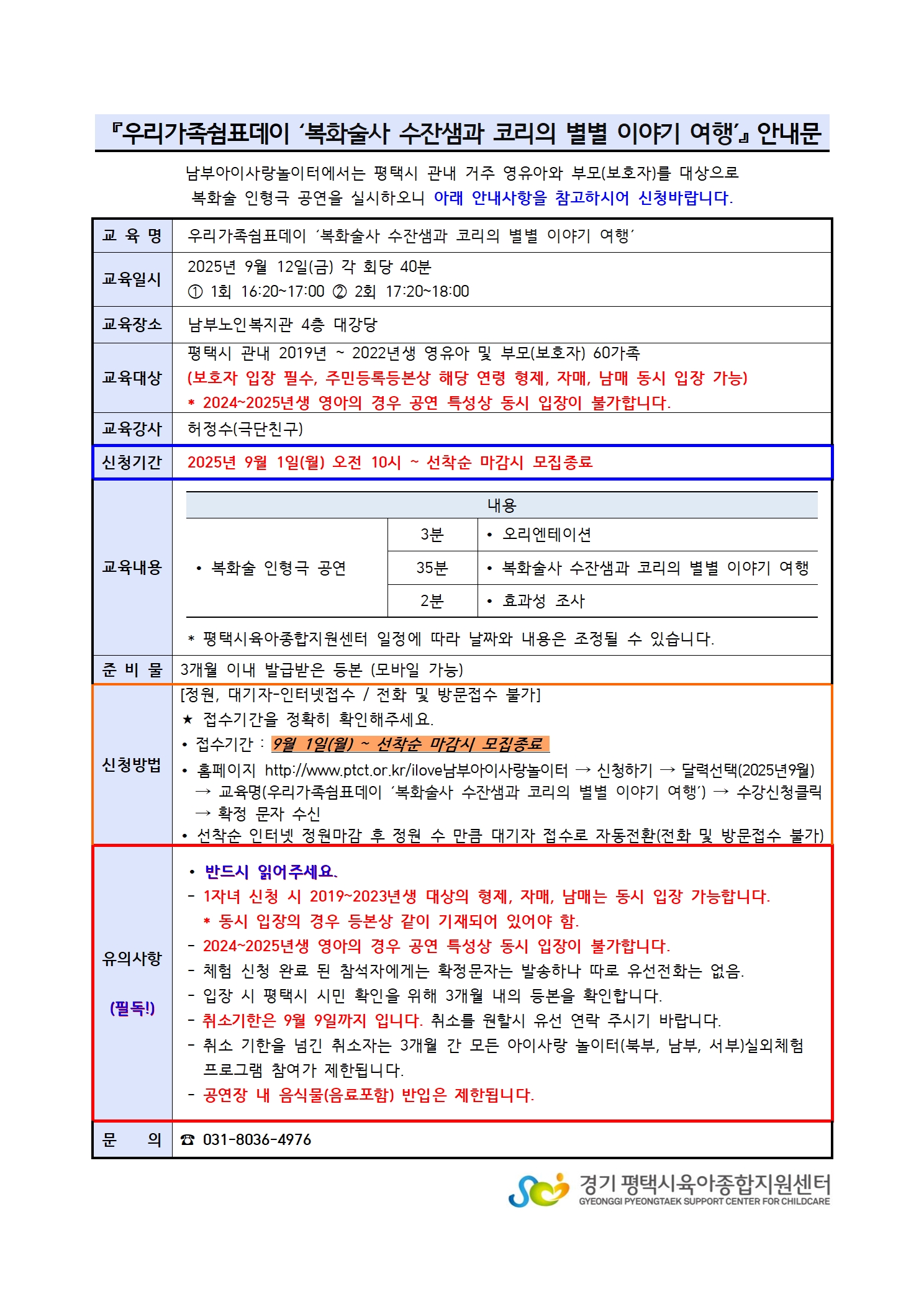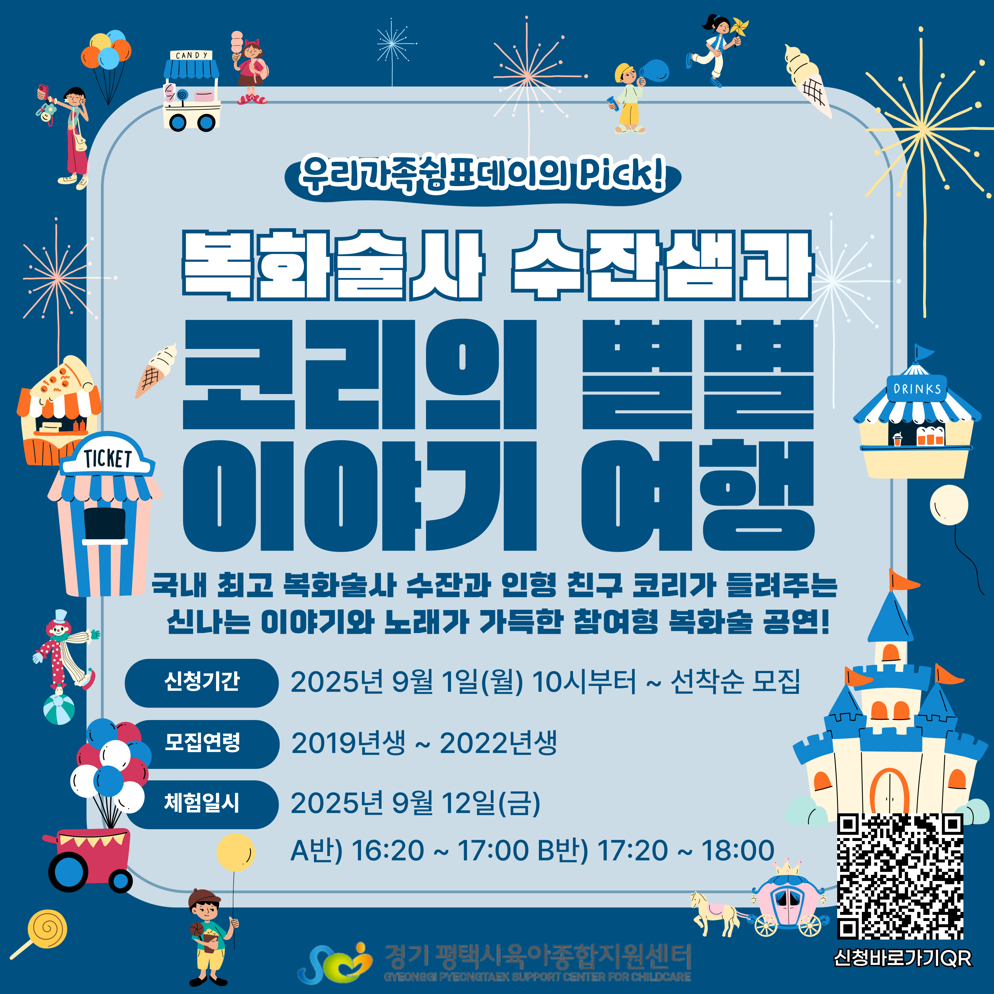 | *9.1.(월) 신청* 우리가족 쉼표데이 '복화술사 수잔샘과 코리의 별별 이야기 여행' A반 | |||