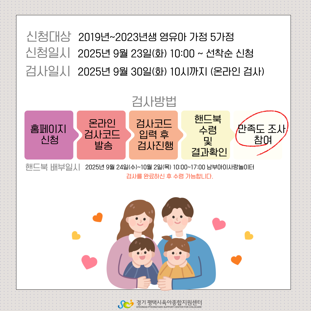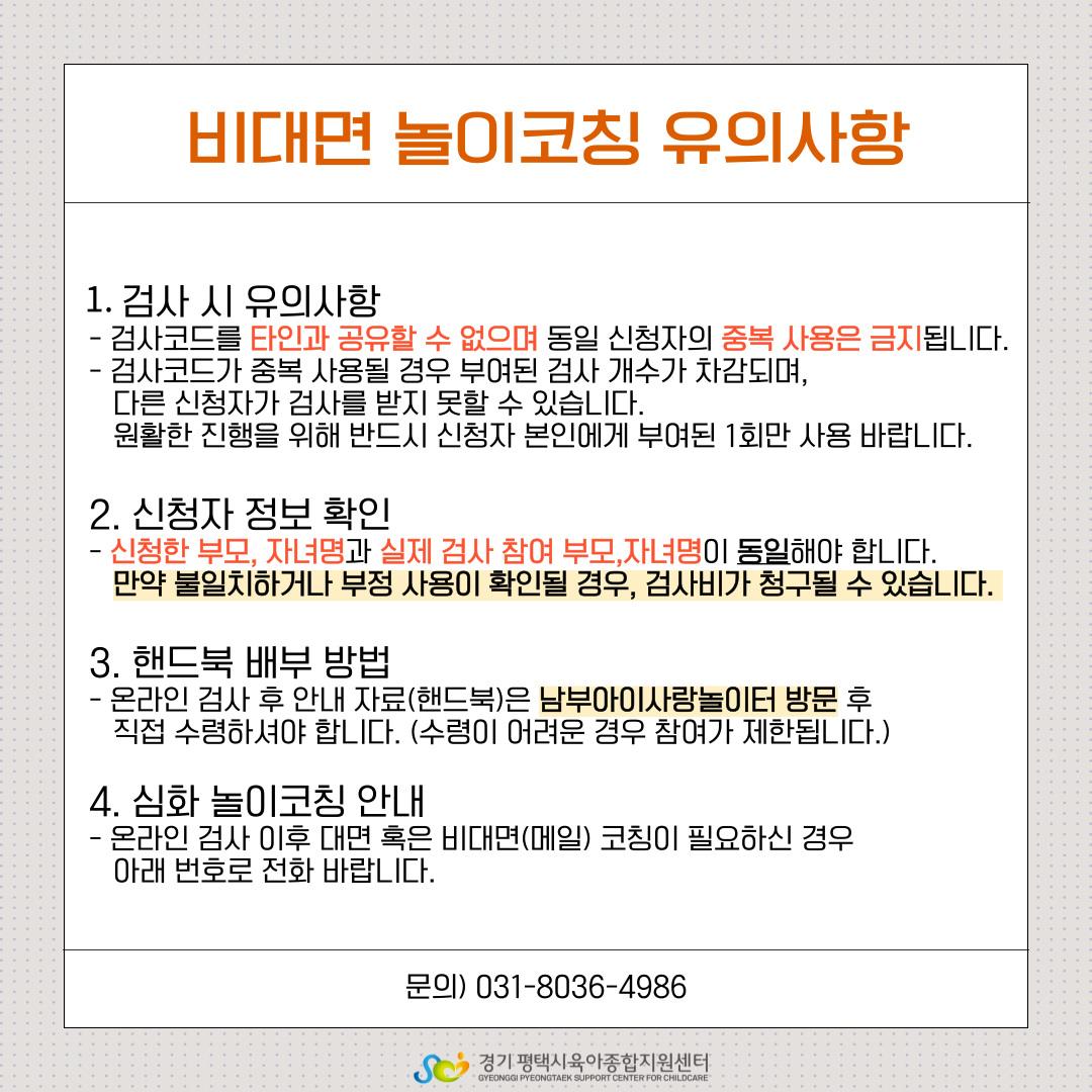 1. 온라인 검사 이후 남부아이사랑놀이터에서 안내 책자를 직접 수령하셔야 합니다.