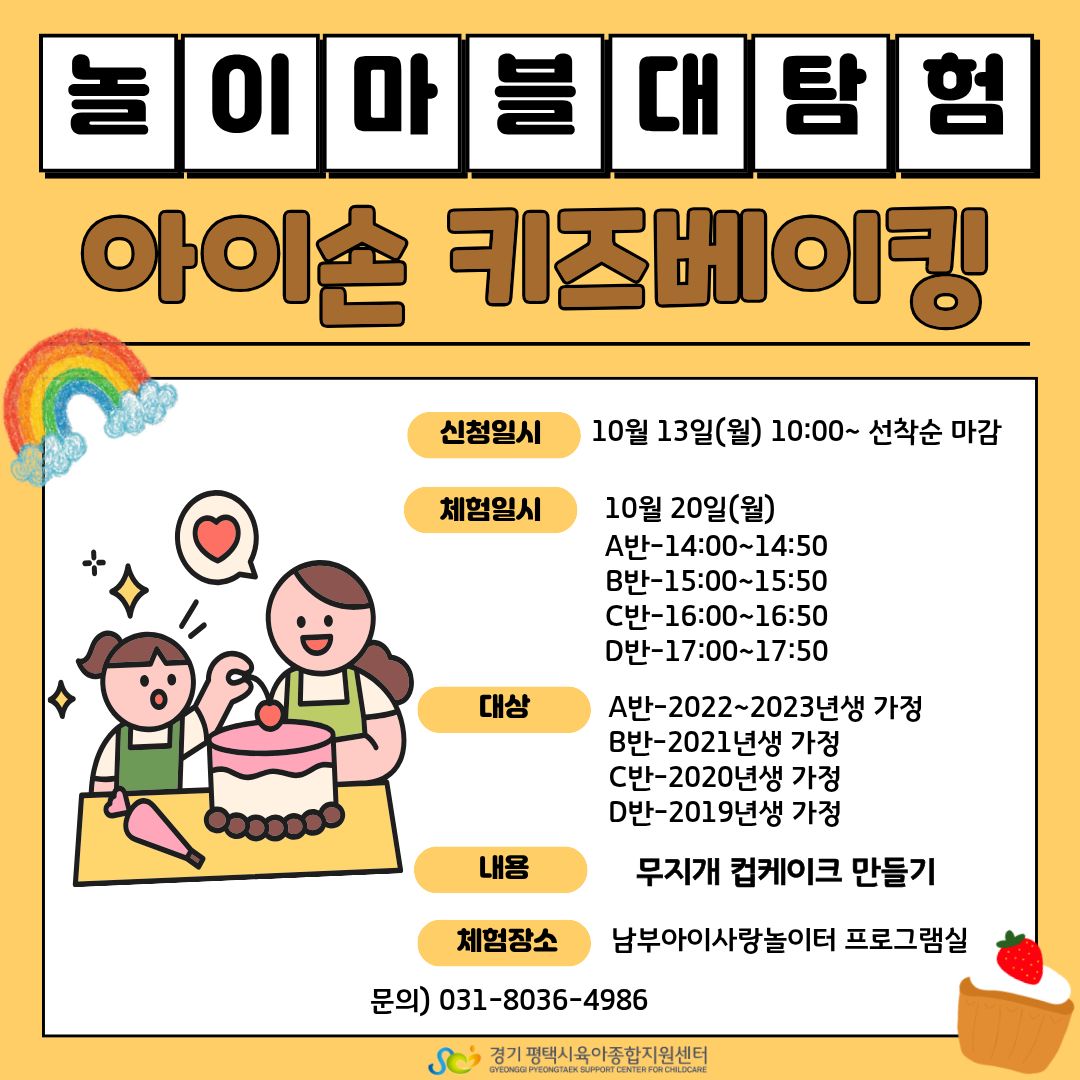 놀이지도사 놀이프로그램 놀이마블 대탐험-아이손 키즈베이킹 -무지개 컵케이크 만들기- A반 - 2022~2023년생 11가정 ※ 안내문 미숙지로 인한 불이익은 신청자에게 있으니 꼭 읽어주시기 바랍니다.