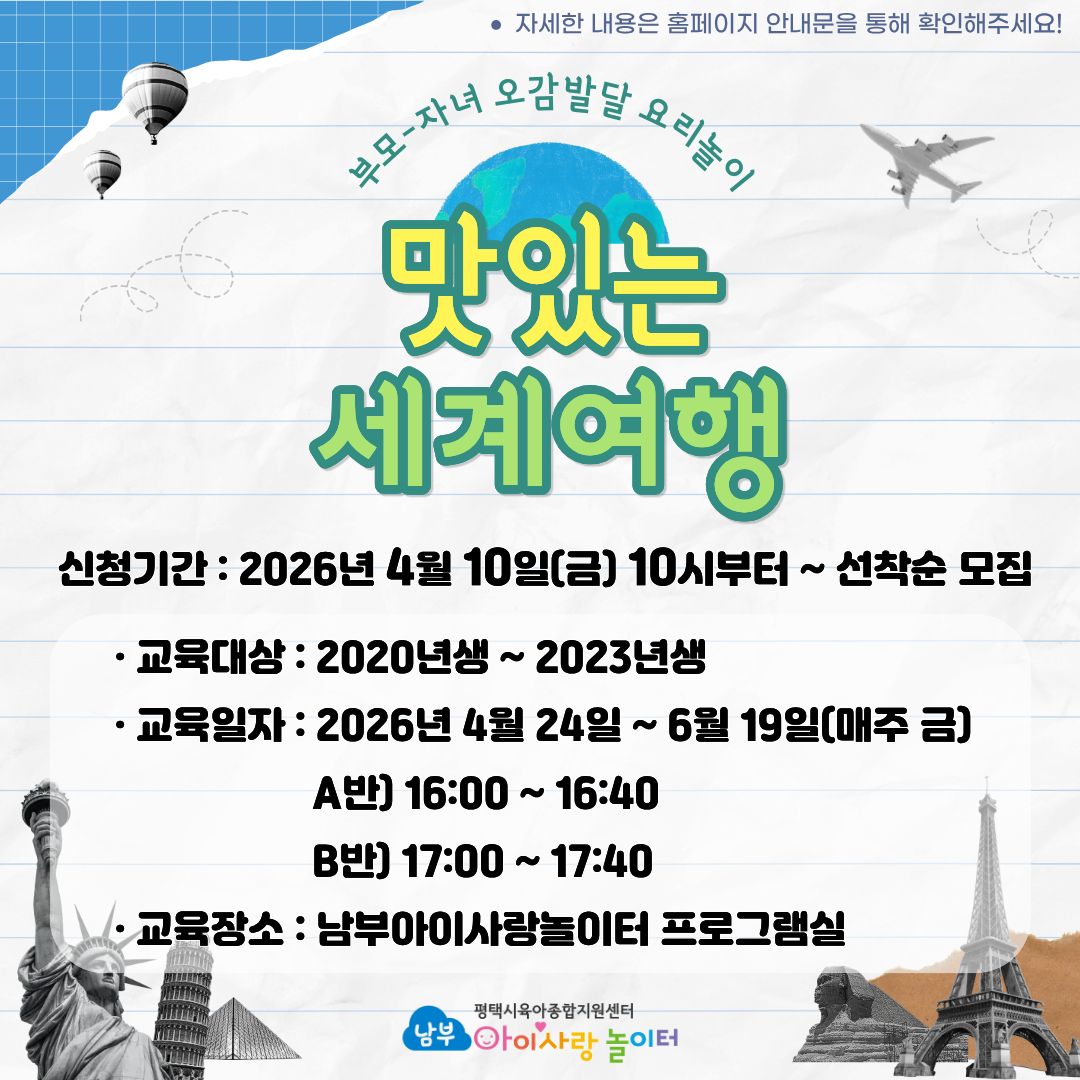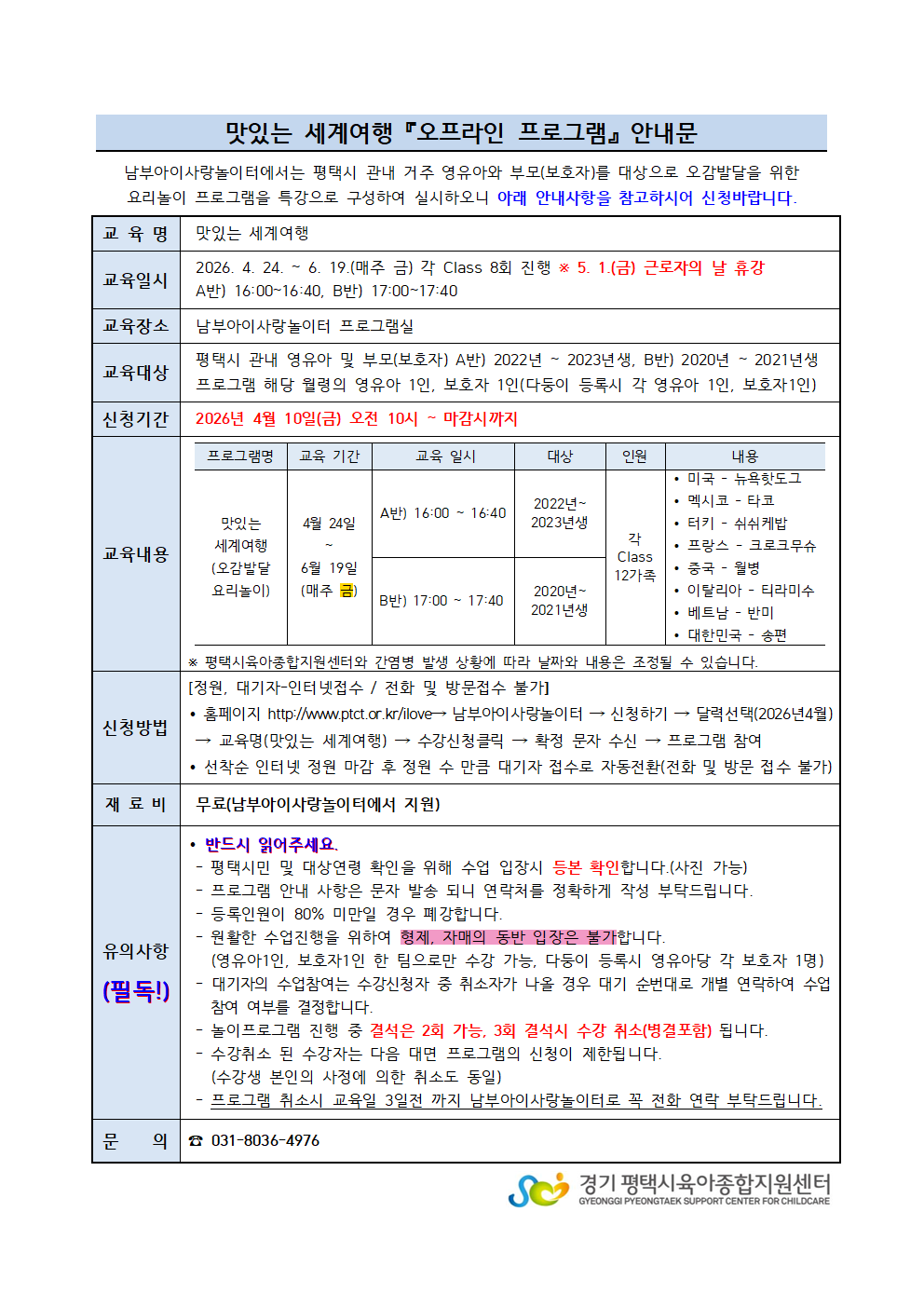 맛있는 세계여행 B반 본 프로그램은 오프라인 프로그램으로 남부아이사랑놀이터 프로그램실에서 4. 24.(금) ~ 6. 19.(금) 17:00~17:40(40분) 총 8회 진행됩니다. ** 5.1.(금) 근로자의 날 휴강 ** ※ 안내문 미숙지로 인한 불이익은 신청자에게 있으니 꼭 읽어주시기 바랍니다 ※