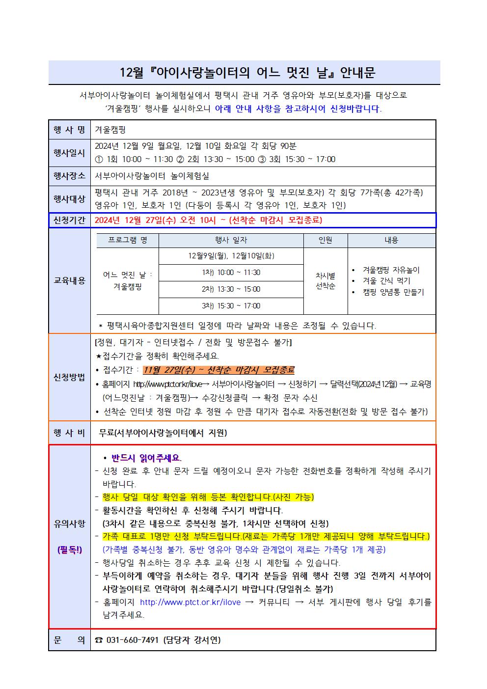 | 서부복지타운 내 이용자가 증가하여 주차장 이용이 어려울 수 있습니다.  도보나 대중교통을 이용하시어 방문해주시면 감사하겠습니다. 평택시 안중읍 서동대로 1557 4층 서부아이사랑놀이터 어느 멋진 날 - 겨울캠핑  본 프로그램은 놀이체험실 대면 행사로  2024년 12월 10일 (화) 15:30~17:00에 진행됩니다. 놀이체험실에서 진행되는 겨울캠핑 자유놀이체험, 겨울 간식먹기, 캠핑양념통 만들기 행사가 준비되어 있으니 가족과 함께 참여해 주세요.