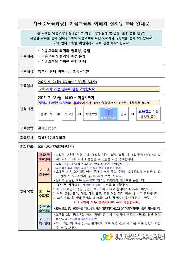 교육대상 평택시 관내 보육교직원 강사명 김혜전(중부대학교)