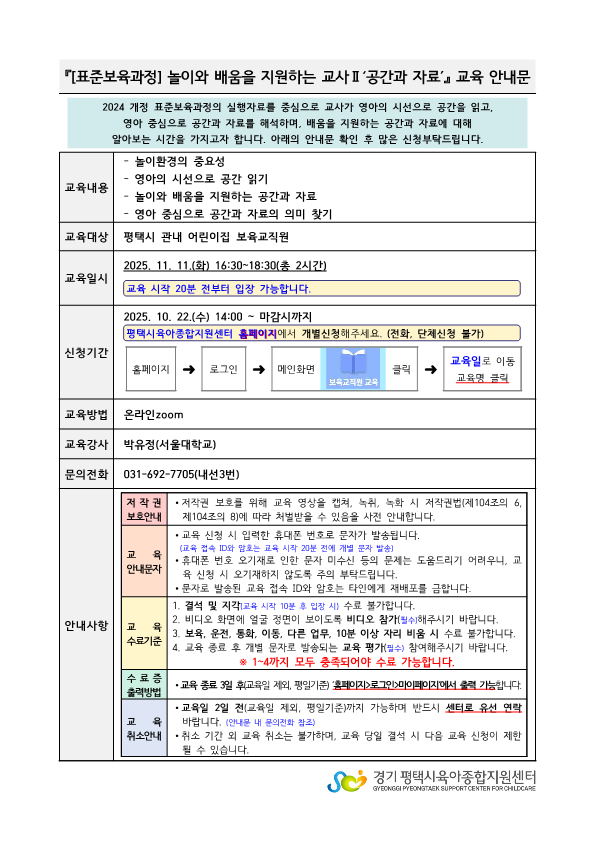 교육명 [표준보육과정] 놀이와 배움을 지원하는 교사Ⅱ '공간과 자료' 교육형태 온라인 zoom