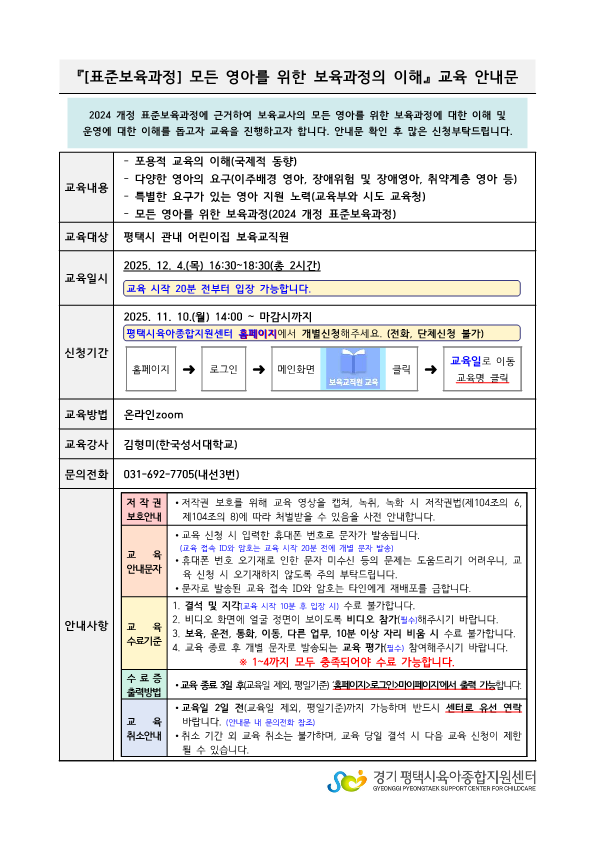 교육대상 평택시 관내 보육교직원 강사명 김형미(성서대학교)