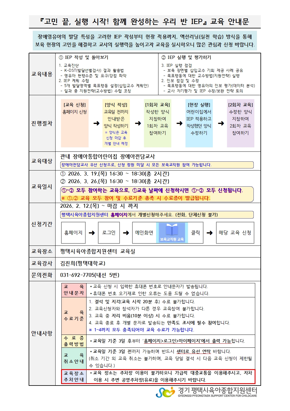 교육대상 평택시 관내 장애아통합어린이집 장애아전담교사 강사명 김진희(평택대학교)