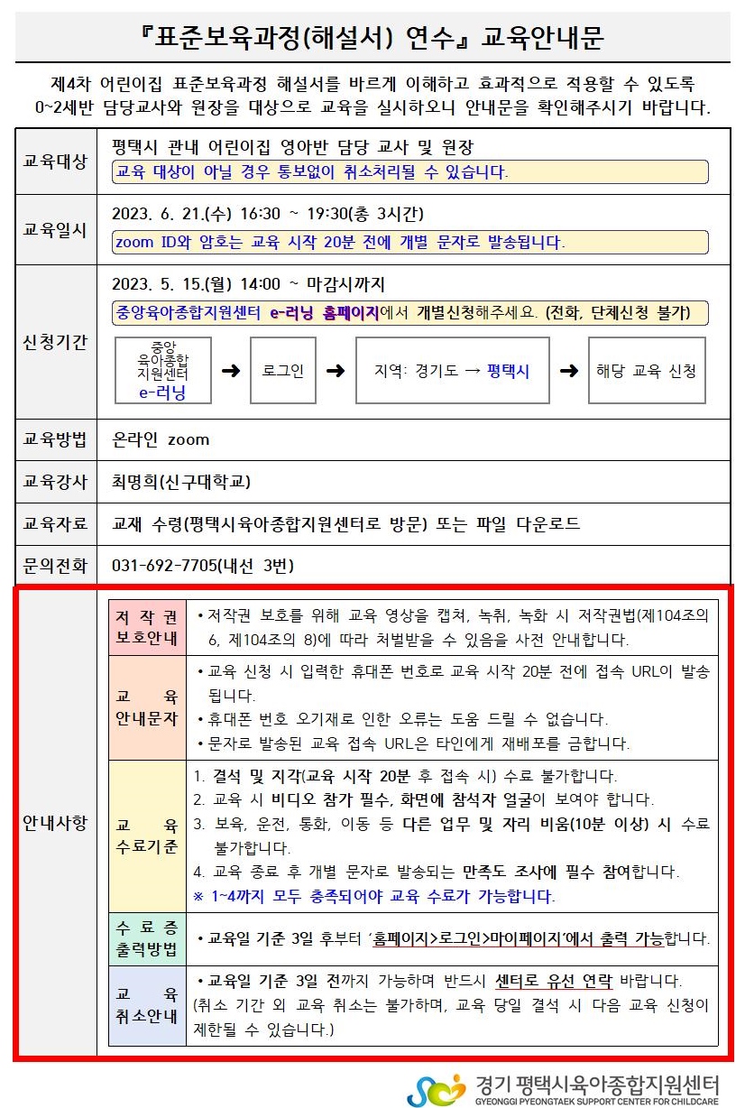 | ★ 교육 신청은 중앙육아종합지원센터 e-러닝에서 신청해주시기 바랍니다. 신청기간: 5월 15일 14시 ~ 마감시까지 신청방법: 중앙육아종합지원센터 e-러닝 > 로그인 > 보육교직원용 집합교육 > 지역별 검색: 경기 - 평택시 ※ 신청기간 전에는 e-러닝 사이트에 교육이 보이지 않습니다. 신청기간이 되어야 목록에 보이는 점 참고해주세요. 신청기간 내에 e-러닝 사이트에서 개별 신청해주시기 바랍니다.  | |||