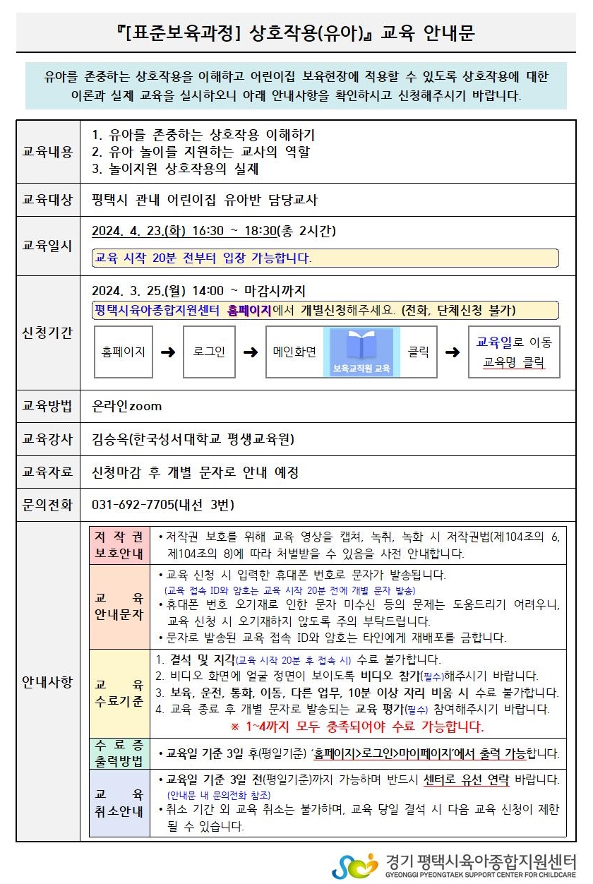 | 첨부파일 |  [표준]상호작용(유아)_2024.4.23.(화)16시30분.jpg  ZOOM교육전_점검사항.jpg  ZOOM접속방법(PC).jpg  ZOOM접속방법(휴대폰).jpg  교육자료_상호작용(유아).pdf | ||