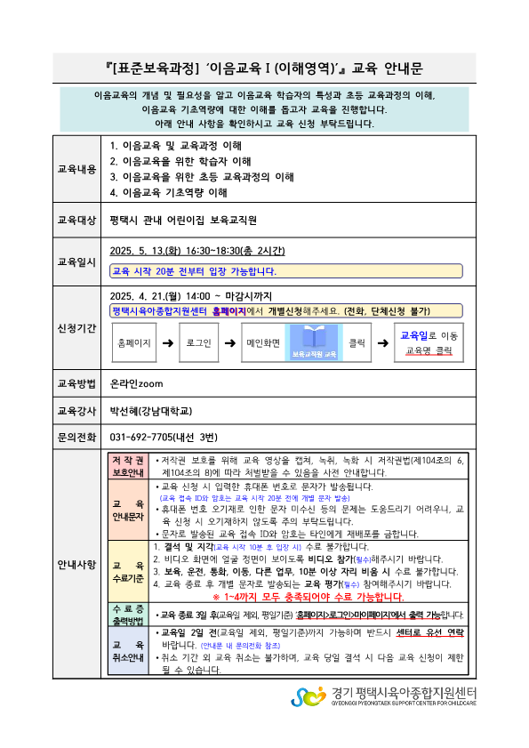 교육대상 평택시 관내 어린이집 보육교직원 강사명 박선혜(강남대학교)