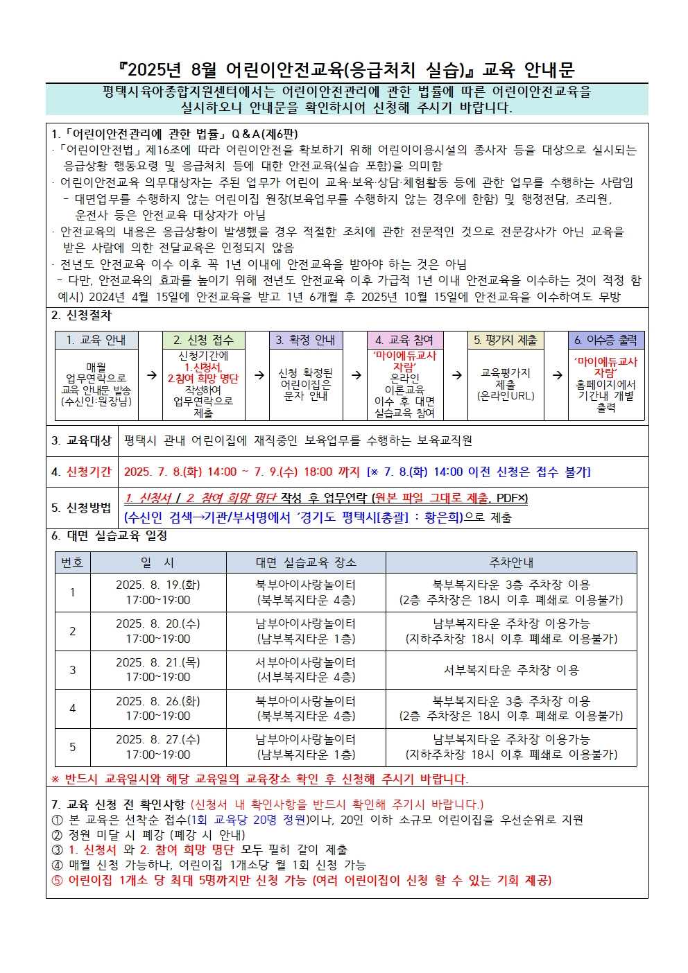 교육명 [안전교육] 8월 어린이안전교육(응급처치실습) 교육안내 - 업무연락으로 신청하기 교육형태 오프라인 소규모