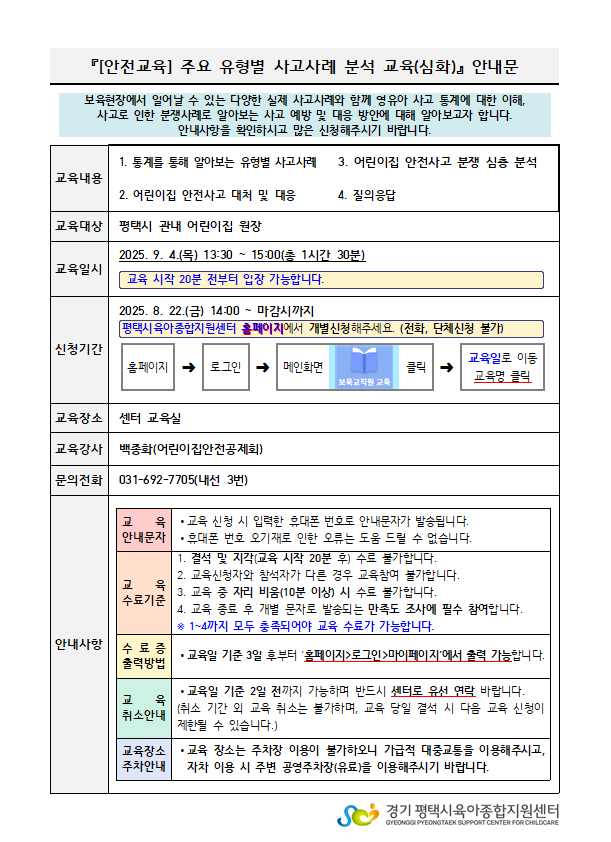 교육대상 평택시 관내 어린이집 원장 강사명 백종화(어린이집안전공제회)