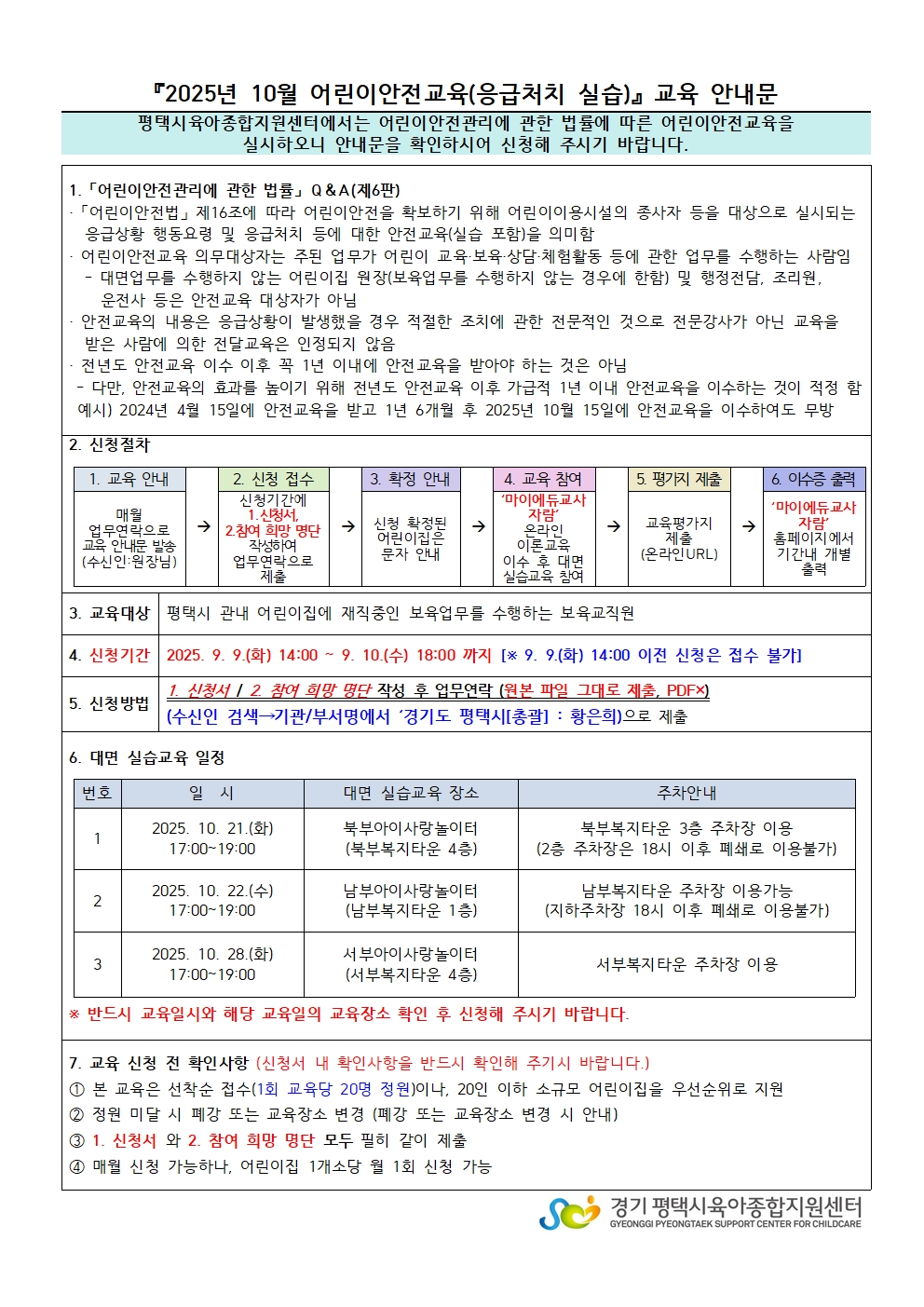 기타사항 10월 교육안내문 및 신청서는 보육통합정보시스템 업무연락(9.1.(월) 원장님)으로 발송