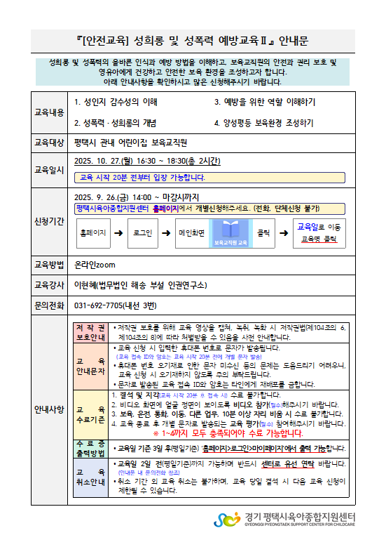 교육명 [안전교육] 성희롱 및 성폭력 예방교육Ⅱ*2025년 마지막 일정* 교육형태 온라인 zoom