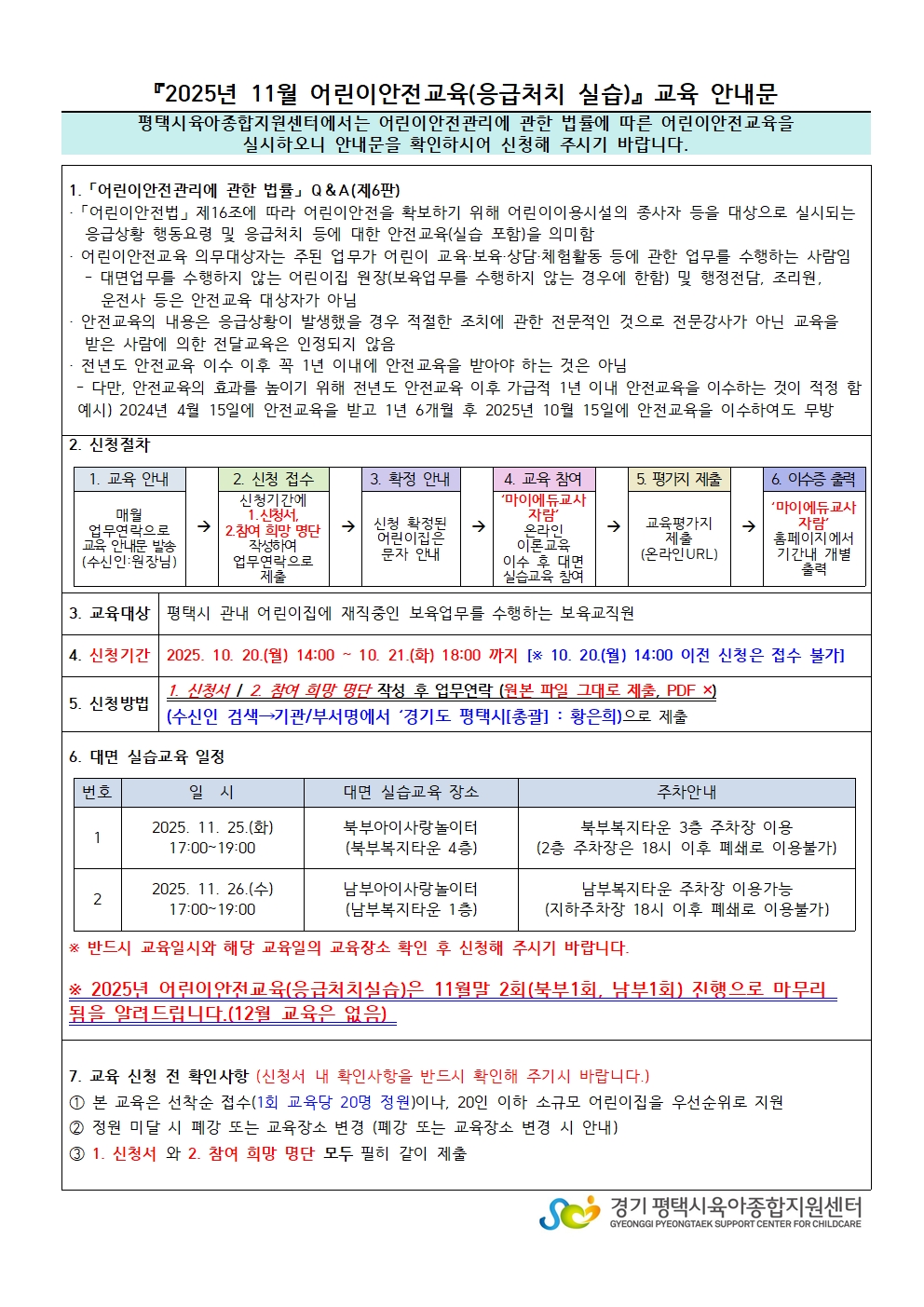 교육명 [안전교육] 11월 어린이안전교육(응급처치실습) 교육안내 - 업무연락으로 신청하기 교육형태 오프라인 소규모