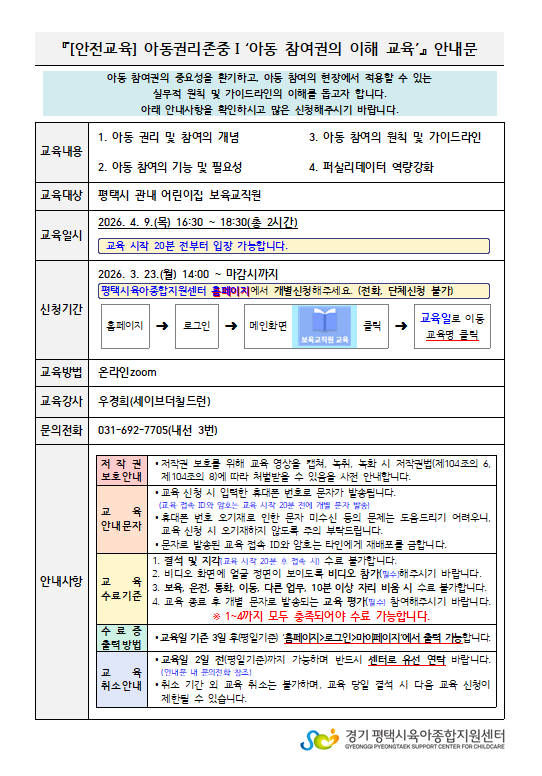 교육명 [안전교육] 아동권리존중Ⅰ'아동 참여권의 이해 교육' 교육형태 온라인 zoom