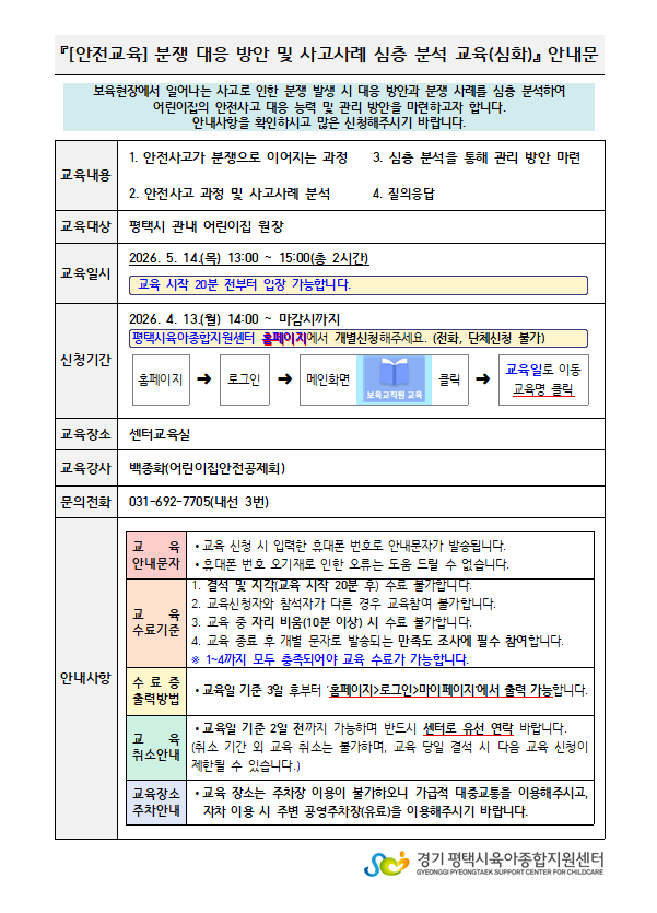 교육대상 평택시 관내 원장 강사명 백종화(어린이집안전공제회)
