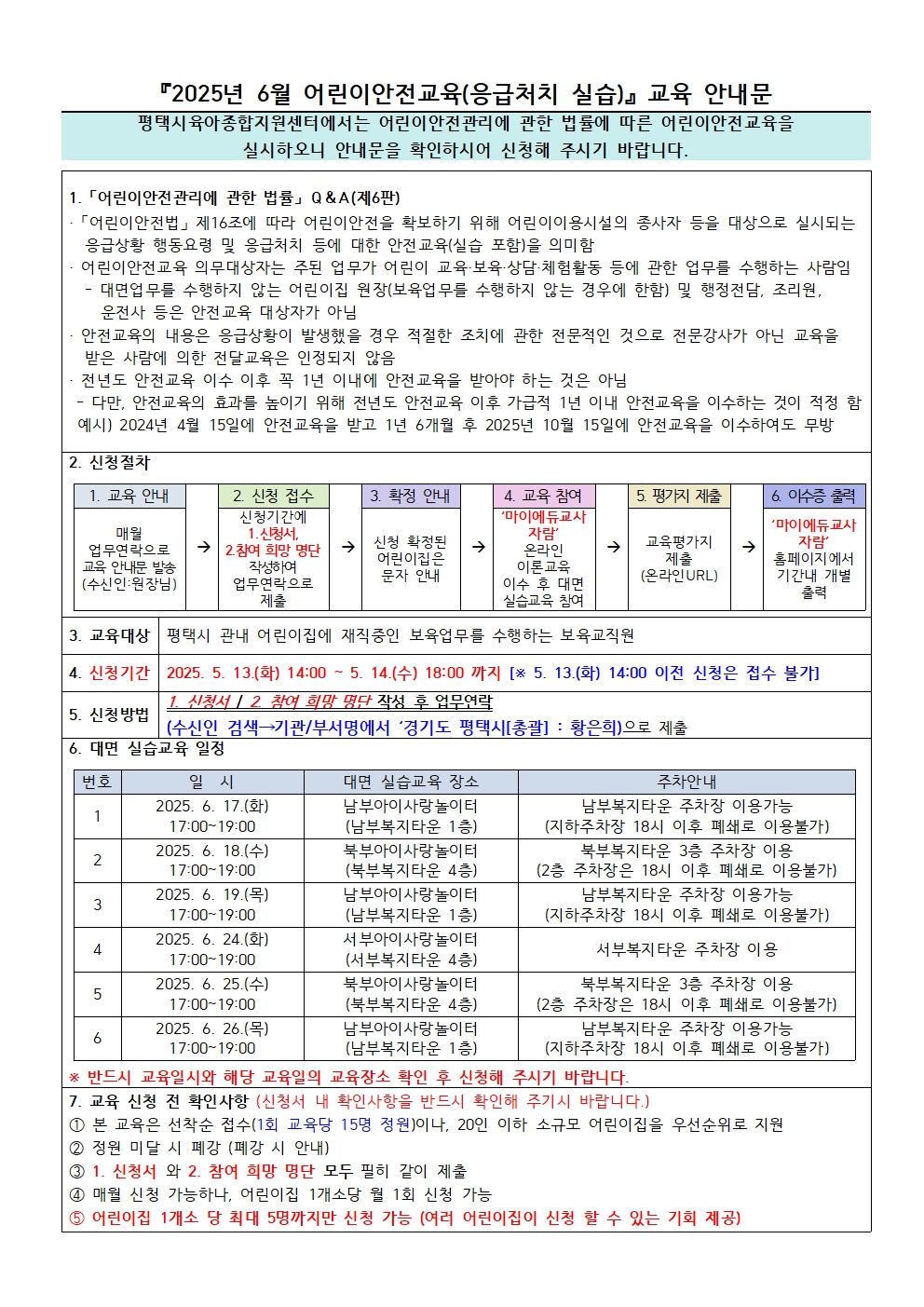교육명 [안전교육] 6월 어린이안전교육(응급처치실습) 교육안내 - 업무연락으로 신청하기 교육형태 오프라인 소규모