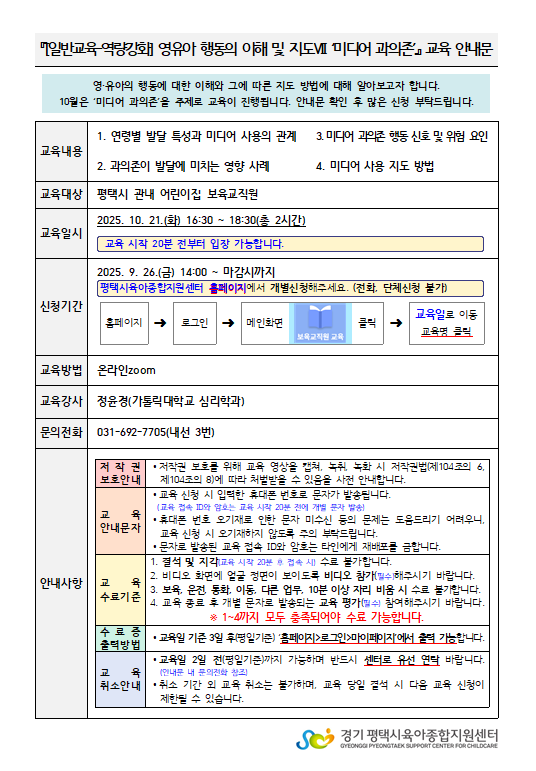 교육대상 평택시 관내 보육교직원 강사명 정윤경(가톨릭대학교 심리학과)