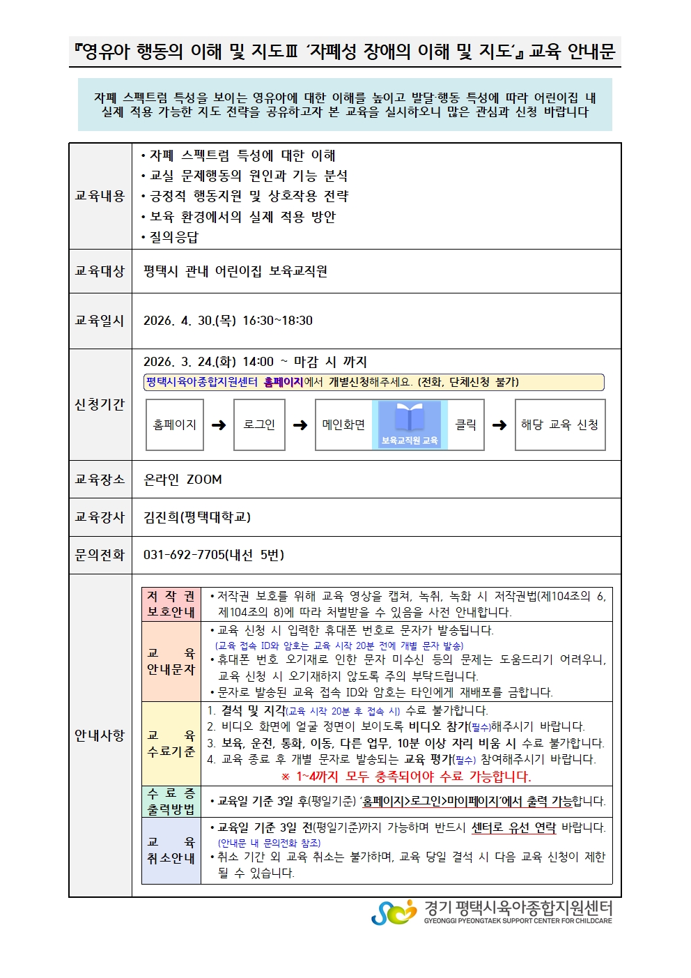교육명 [일반교육] 영유아 행동의 이해 및 지도Ⅲ ‘자폐성 장애의 이해 및 지도‘교육 교육형태 온라인 zoom